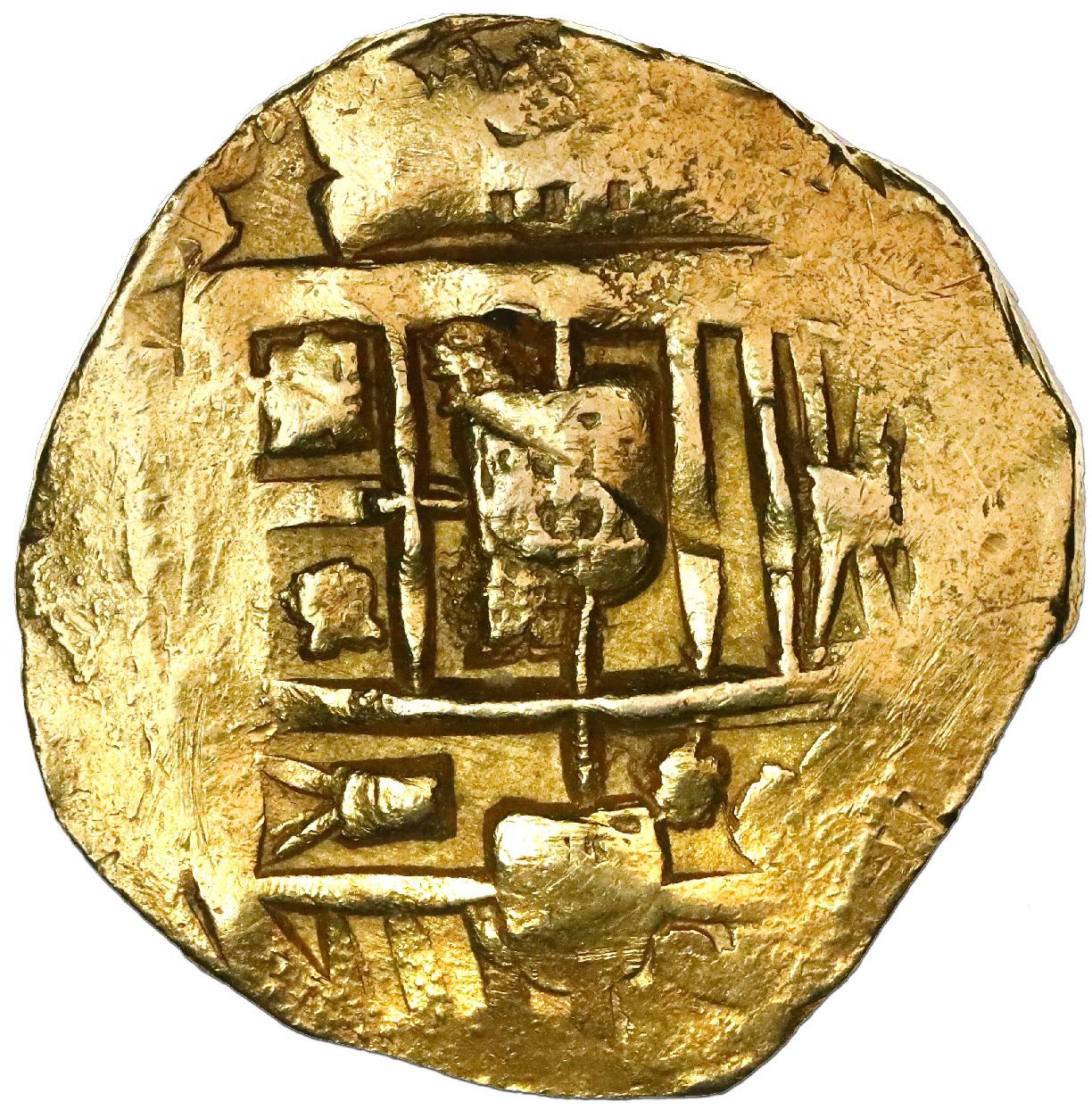 Seville, Spain, cob 8 escudos, Philip IV, assayer not visible. Cal-Type 406. 26.87 grams. Bold, heavy features in nearly full shield and cross (the latter slightly off-center), typically somewhat crude in appearance but technically XF, with subtle edge-filing from being in jewelry.