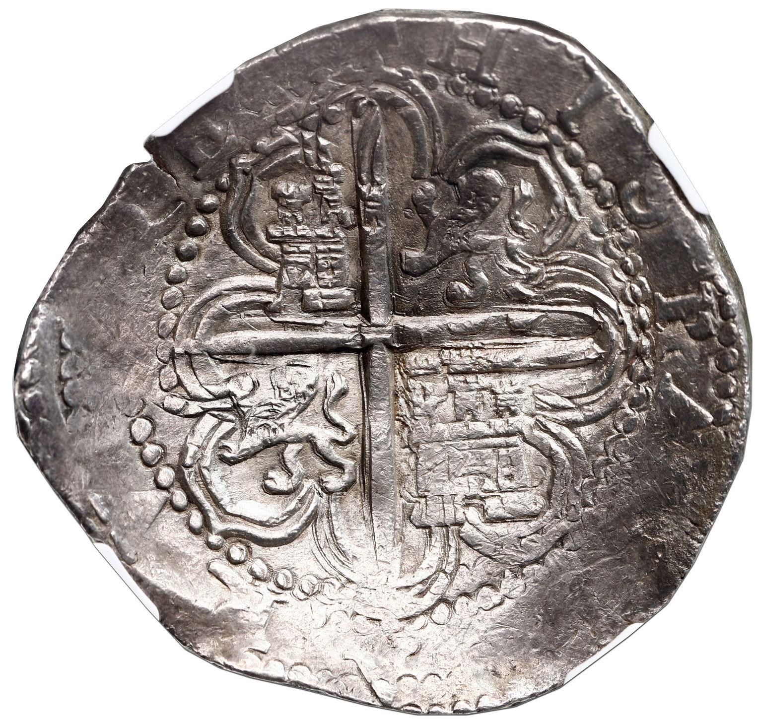 Seville, Spain, cob 8 reales, 1590 date to right, assayer Gothic D below denomination o-VIII and min