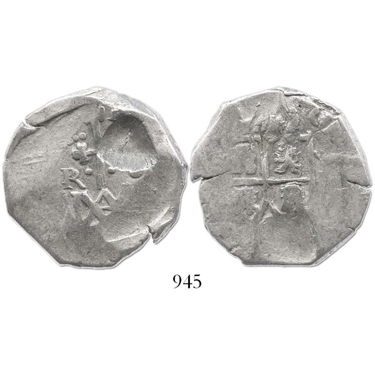Seville, Spain, cob 8 reales, Charles II, "Maria" type (1686-99), assayer not visible. CT-Type 83. 21.7 grams. Typically crude but with decent central detail (shield and cross-topped monogram), large natural void on monogram side, AVF overall, interesting variety with R of denomination punched over a smaller R.