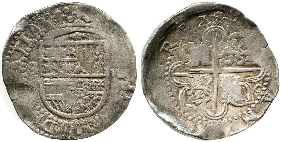 Seville, Spain, cob 8 reales, Philip II, assayer C at 4 o'clock outside tressure around cross, rare.
