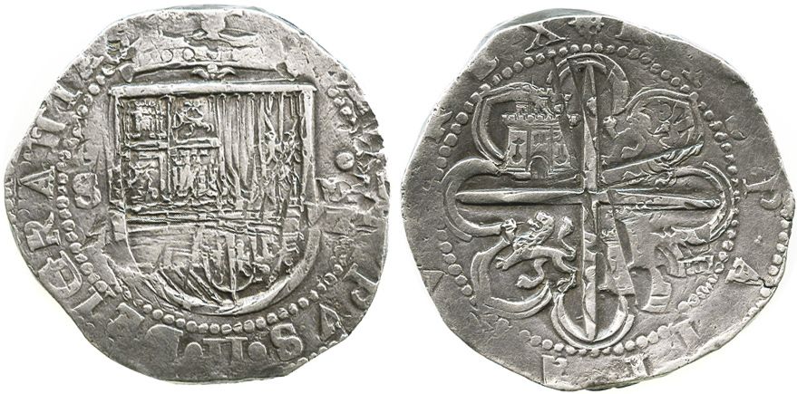 Seville, Spain, cob 8 reales, Philip II, assayer Gothic D at 4 o'clock outside tressure around cross