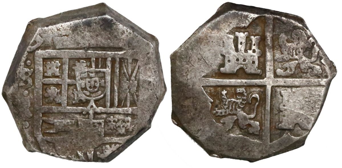 Seville, Spain, cob 8 reales, Philip IV, assayer R. CT-Type 127. 27.31 grams. Very thick and sharply octagonal flan with nearly full shield and cross, clear mintmark S, AVF with light toning. Pedigreed to our Auction #2 (lot #384).