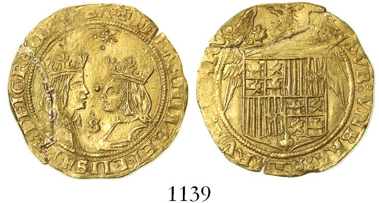 Seville, Spain, double excelente, Ferdinand-Isabel, 8-point star and 4 dots at top, mintmark S and 2