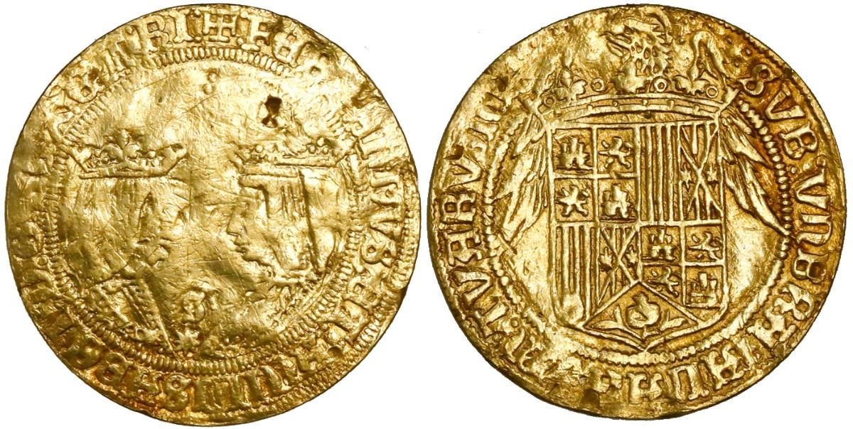 Seville, Spain, double excelente, Ferdinand-Isabel, •S• above eight-pointed star at bottom between busts. CT-72; Fr-129. 6.43 grams. Worn and polished F/VF with punchmarks in field above busts.