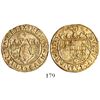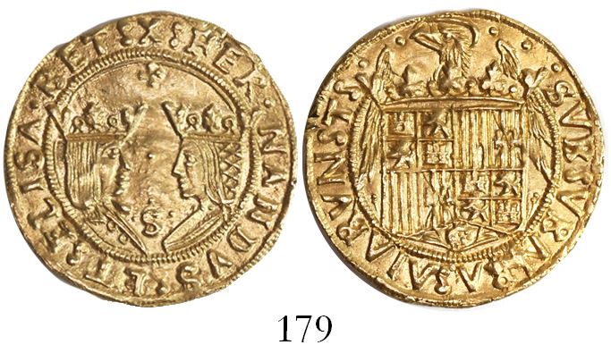 Seville, Spain, double excelente, Ferdinand-Isabel, + at top and S with three dots at bottom between busts. CT-74. 7.00 grams. Choice bold AU+ with full details all over but faint interior bend and tiny (modern) cuts in part of edge.