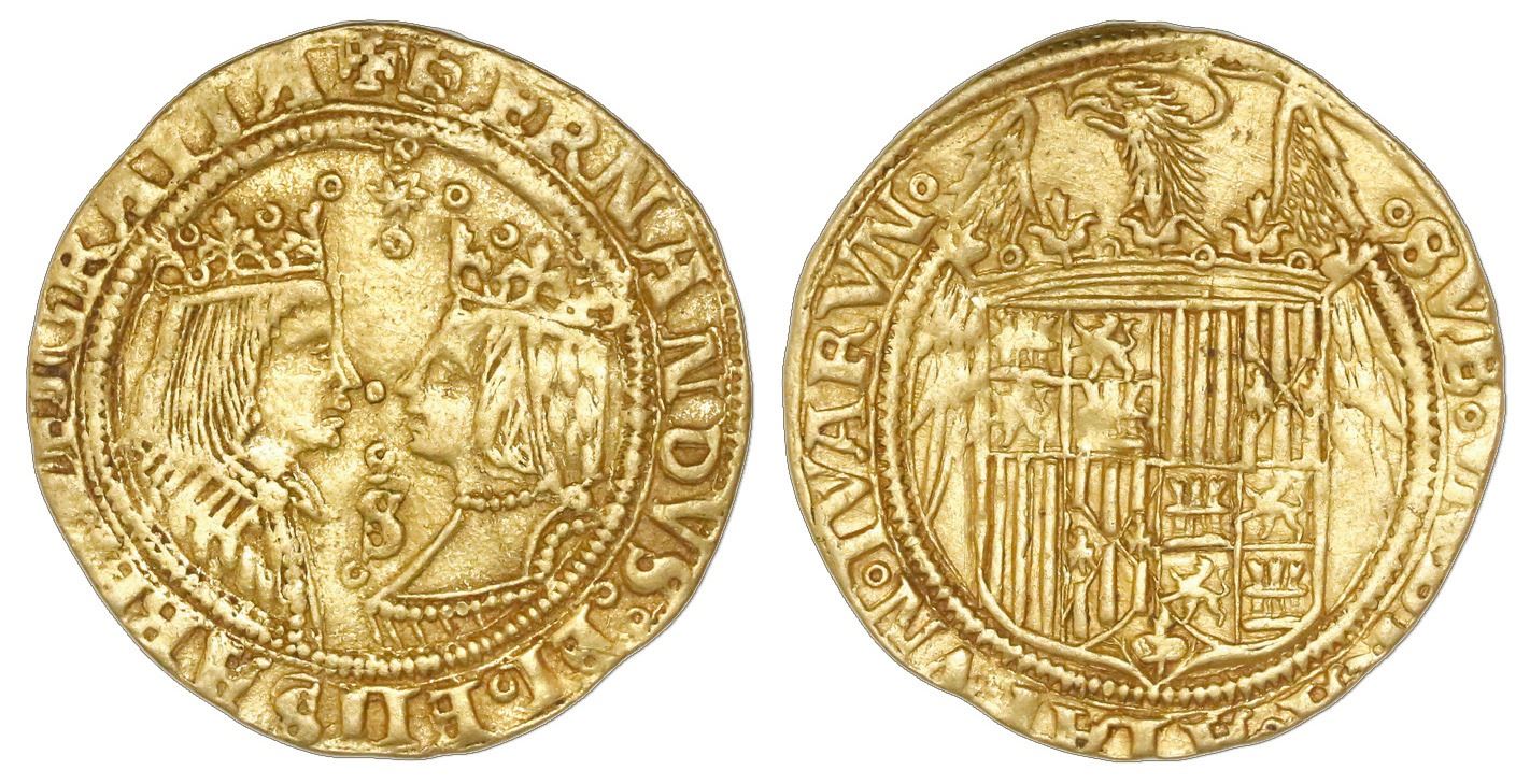 Seville, Spain, double excelente, Ferdinand-Isabel, star and four circlets at top, S and two circlet