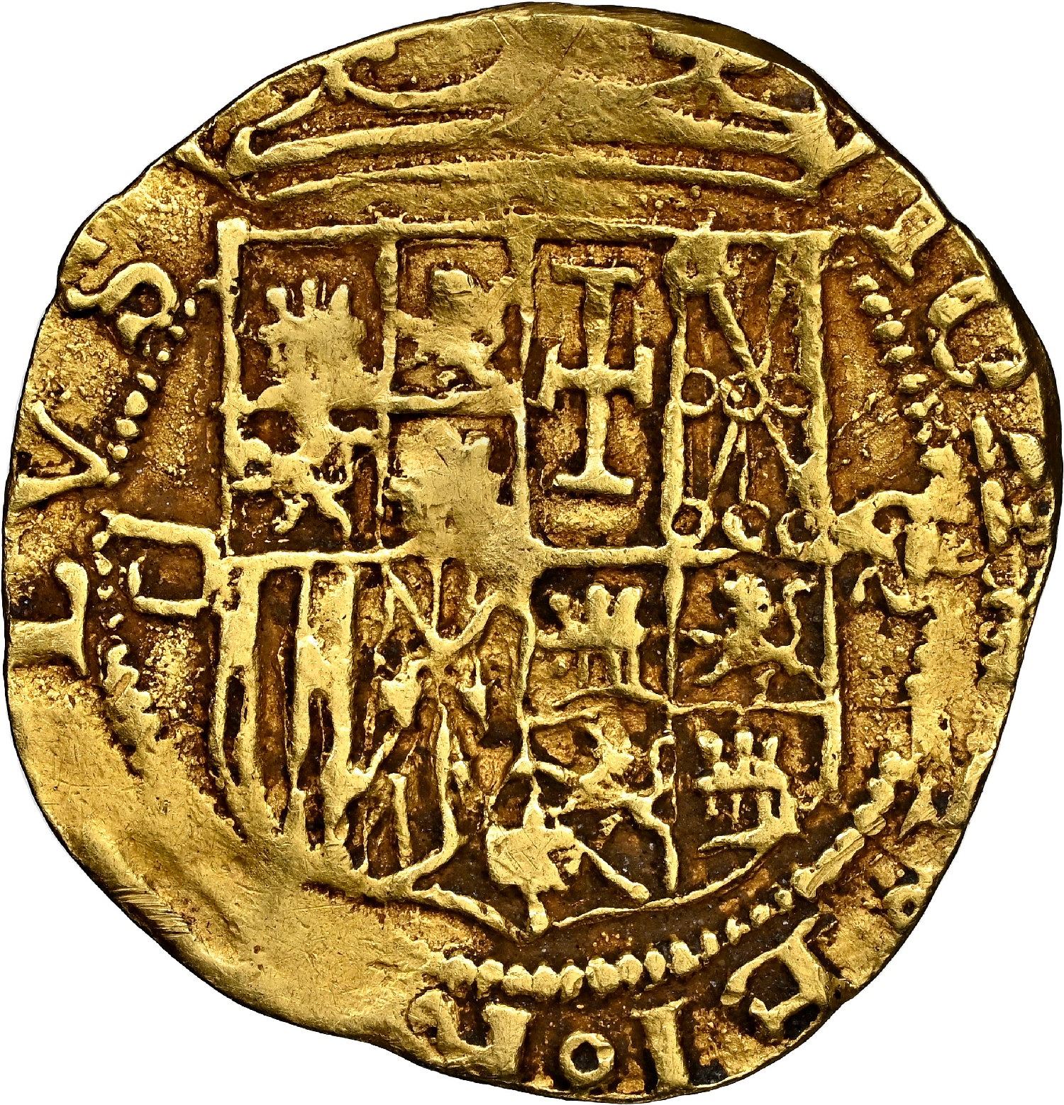 Seville, Spain, gold 1 escudo, Charles-Joanna, assayer Gothic D to left, mintmark S to right, NGC VF 35. Cal-199; Fr-153. 3.32 grams. Nice complete shield with some dark surface sedimentation contrast, doubled and weak yet full cross with a little luster on that side.