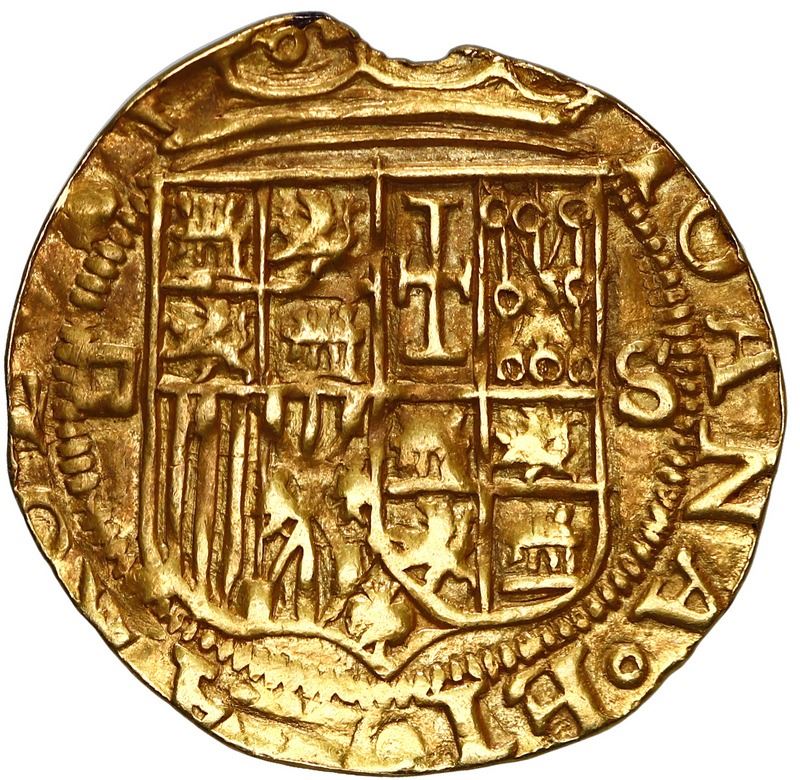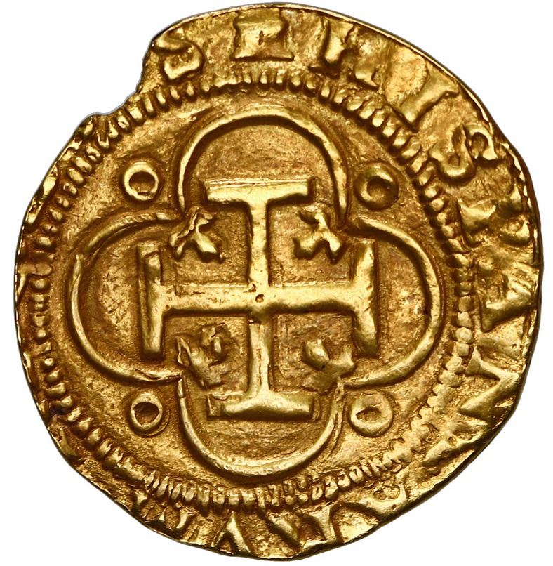 Seville, Spain, gold 1 escudo, Charles-Joanna, assayer Gothic D to left, mintmark S to right. Cal-199. 3.34 grams. Boldly struck AU with full shield and cross, spot of edge damage at top from mount removal.