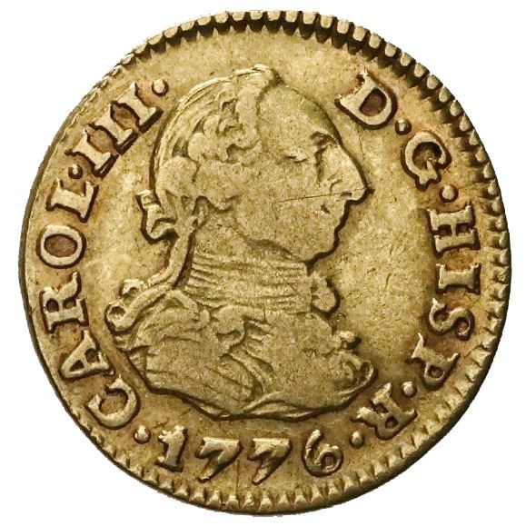 Seville, Spain, gold bust 1/2 escudo, Charles III, 1776CF. Cal-1306; KM-415.2. 1.76 grams. Lightly cleaned VF, popular date.