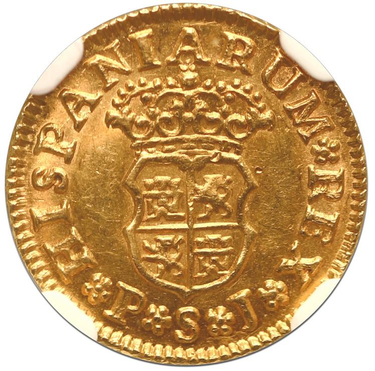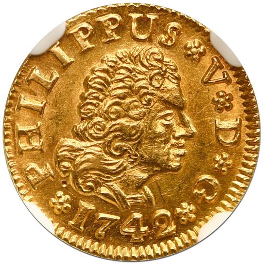 Seville, Spain, gold bust 1/2 escudo, Philip V, 1742 PJ, NGC MS 62. Cal-1644; KM-361.2. Tremendous luster and choice full details, slight flan-bulge in center of reverse, impressively flashy, second finest in NGC census behind a single MS 64.