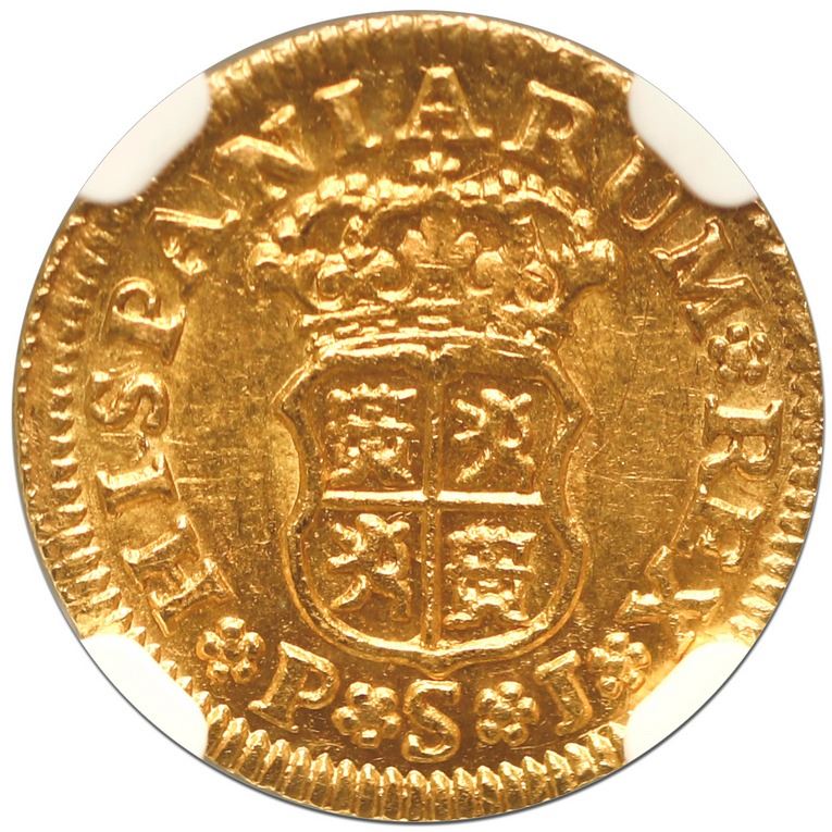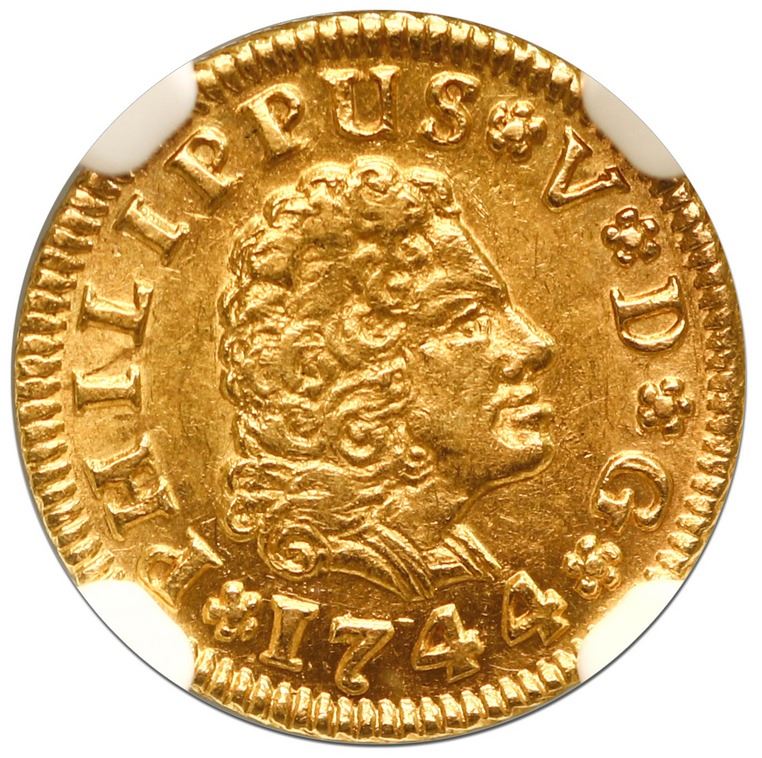 Seville, Spain, gold bust 1/2 escudo, Philip V (third bust), 1744 PJ, NGC MS 62. Cal-1649; KM-361.2. Nice luster with hint of reddish toning, fully detailed strike (centers slightly soft), listed as "top pop" in NGC census but technically tied for second finest behind another example under a different listing (the varieties for this date being second or third bust, not with or without rosettes in legend).