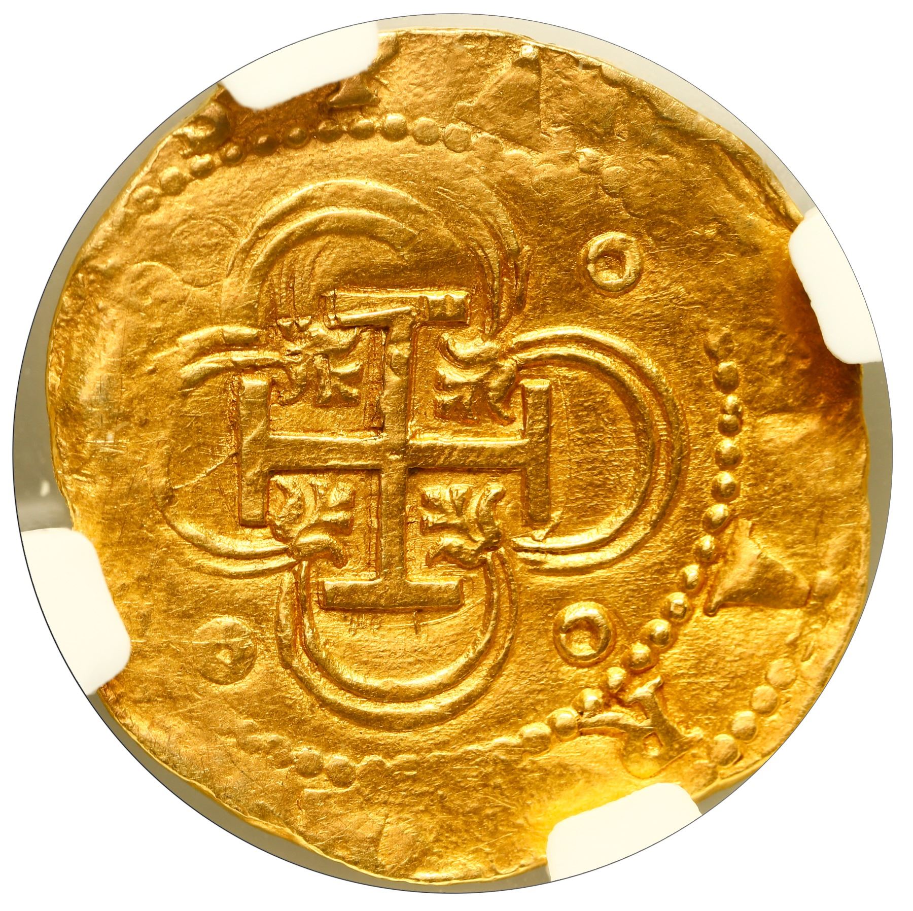 Seville, Spain, gold cob 2 escudos, Philip II, assayer Gothic D below mintmark S to left, NGC MS 62. Cal-828; Fr-169. 6.71 grams. Good full cross, nearly full (and well-detailed) crown and shield, parts of edge on both sides crude (as made), bright golden surfaces all over. Please use this link to verify the certification number