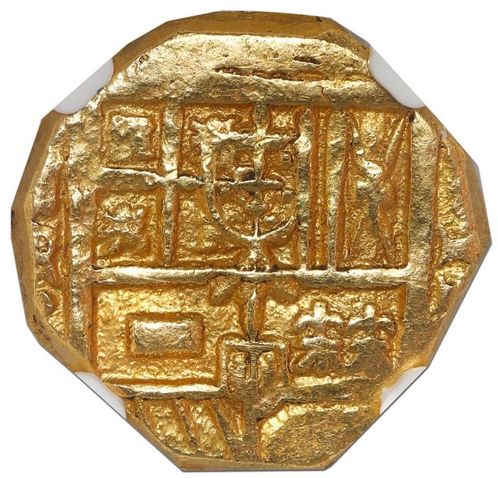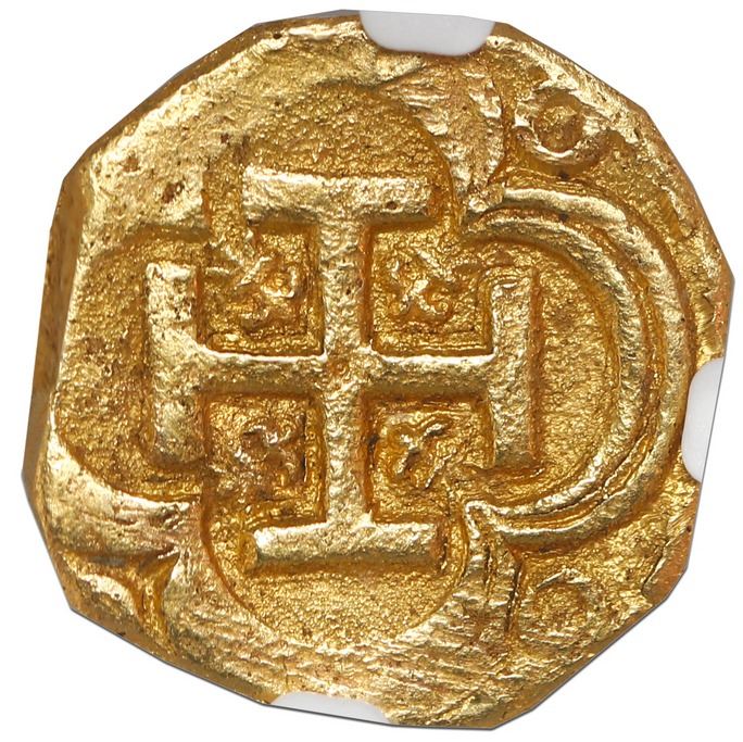 Seville, Spain, gold cob 2 escudos, Philip IV, assayer R, NGC MS 64, finest known in NGC census. Cal-Type 388. 6.72 grams. Deeply struck full shield and cross, both well centered on a thick flan with most of assayer R to left and denomination II to right, attractively toned all over. NGC #5868076-002.