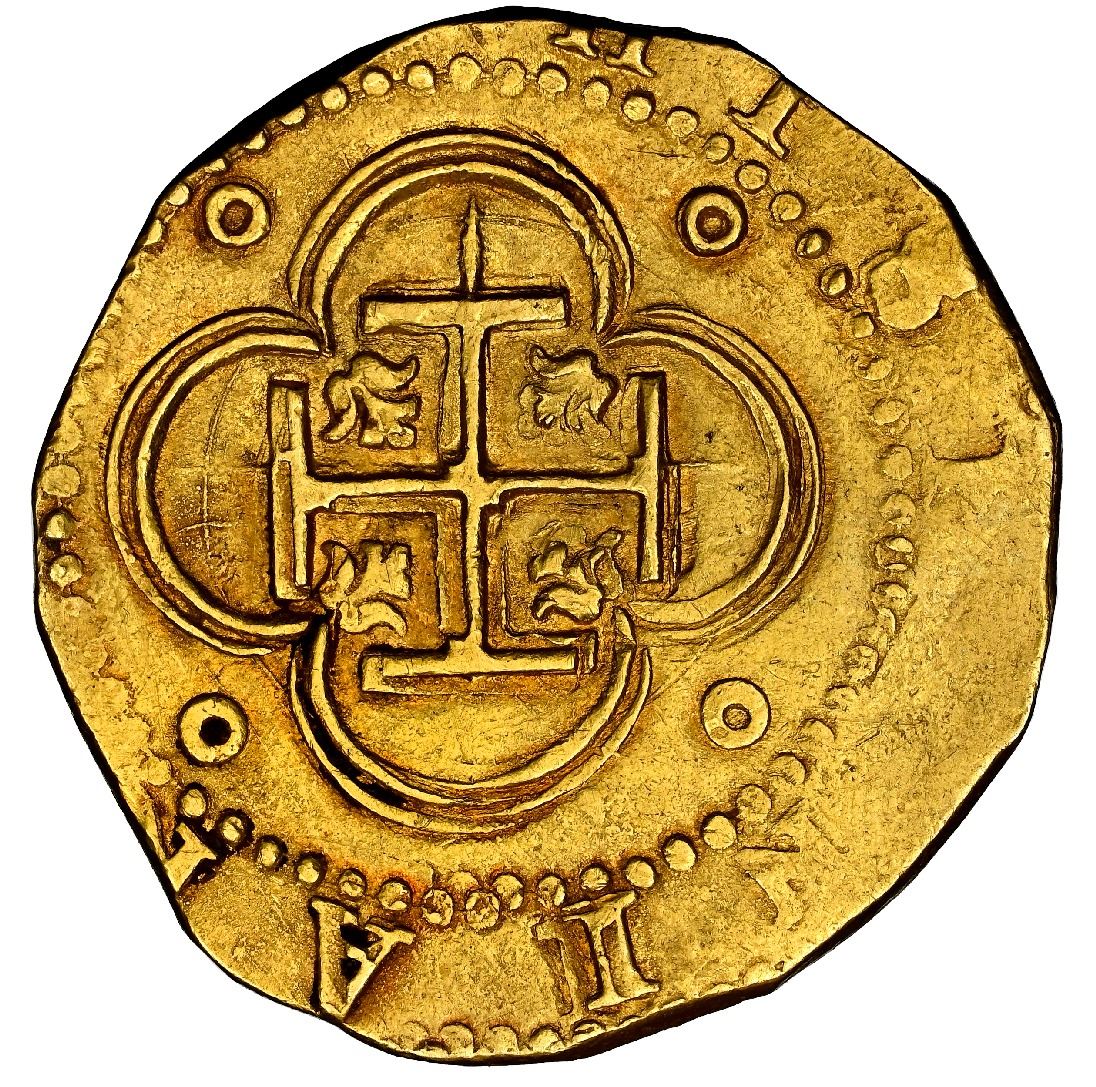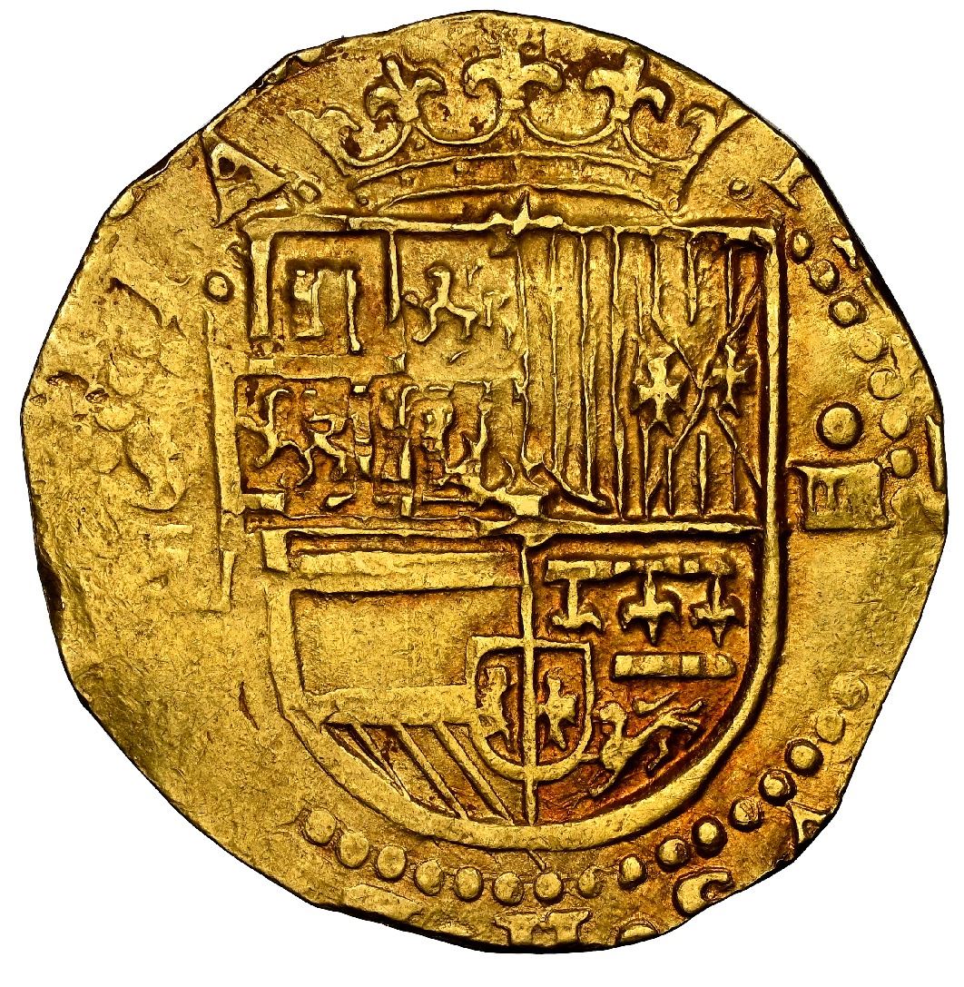 Seville, Spain, gold cob 4 escudos, Philip II, assayer Gothic D below mintmark S to left, NGC MS 62. Cal-887. 13.54 grams. Choice but slightly off-center full cross-and-tressure, the shield also choice and full but with slight doubling at top left, choice full crown and bold denomination, traces of luster and toning in crevices.