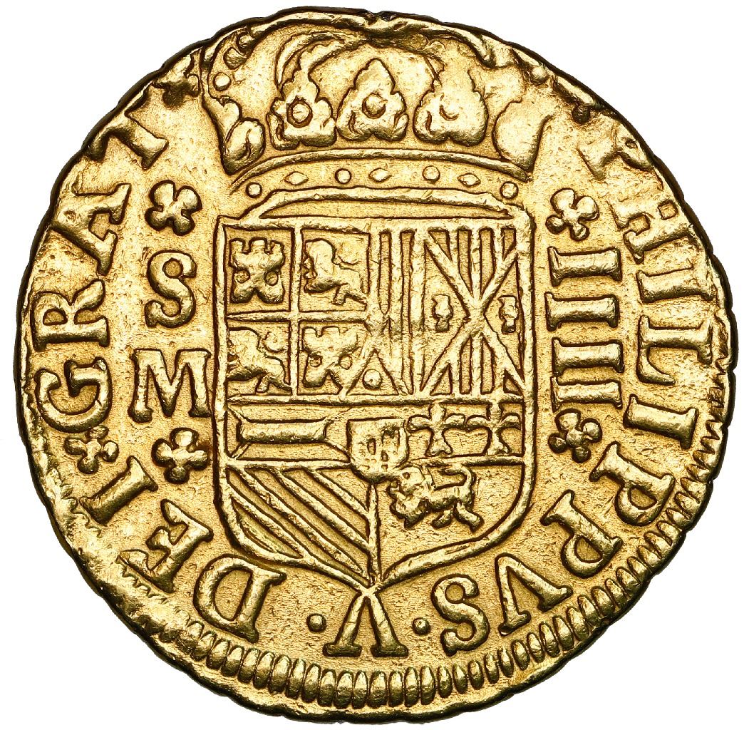 Seville, Spain, gold milled 4 escudos, Philip V, 1701M, mintmark-assayer and denomination on obverse, rare. Cal-2067; KM-256. 13.36 grams. Bold but lightly polished AU with mount-mark removed from top, slightly off-center strike, initial variety of first date of type.