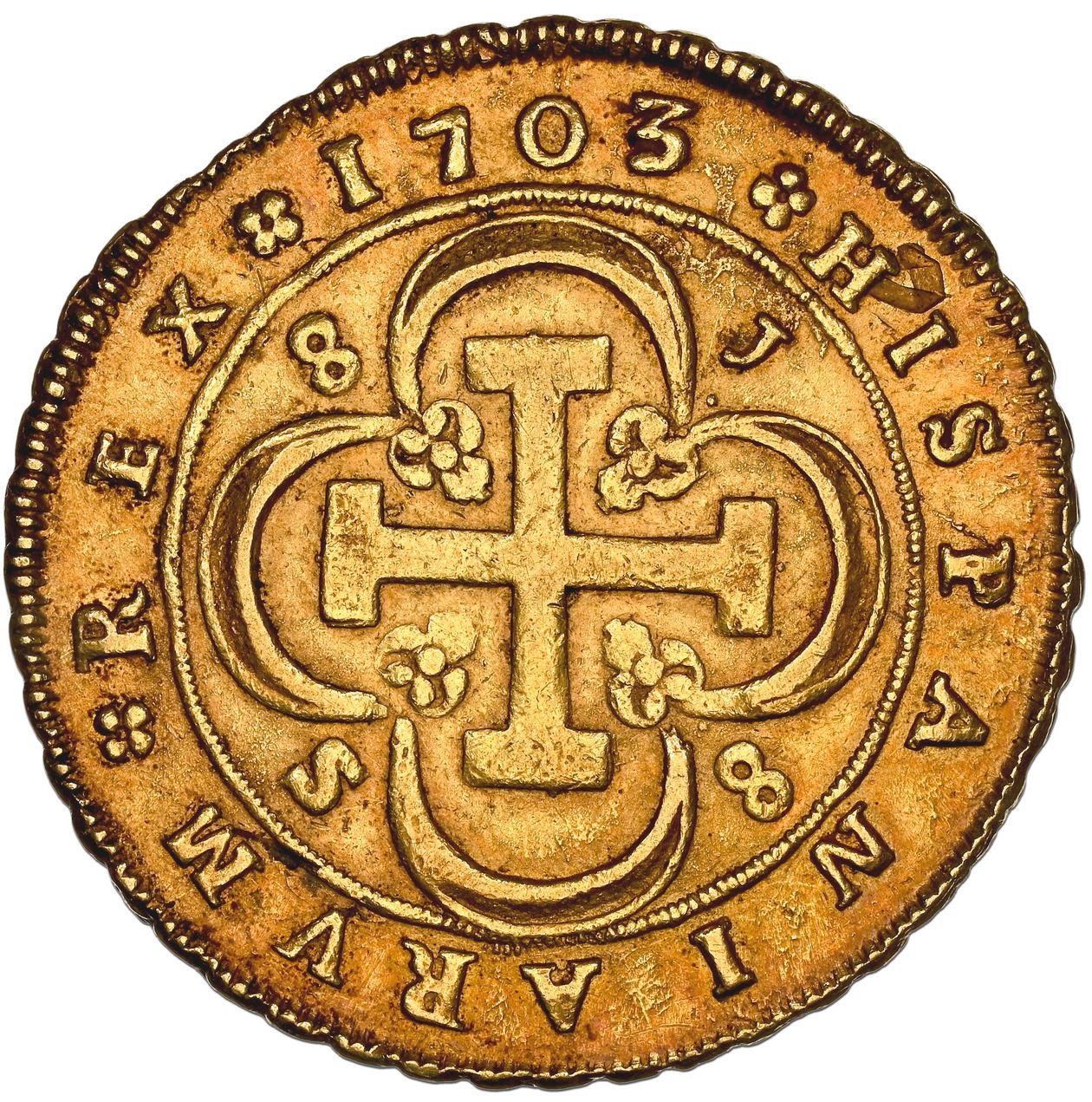 Seville, Spain, gold milled 8 escudos, Philip V, 1703 J, 8-S-8-J in tressure-dimples, NGC AU 58, fin