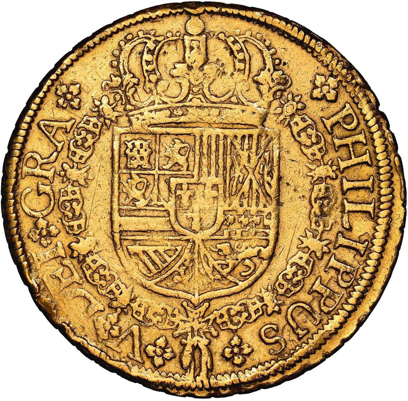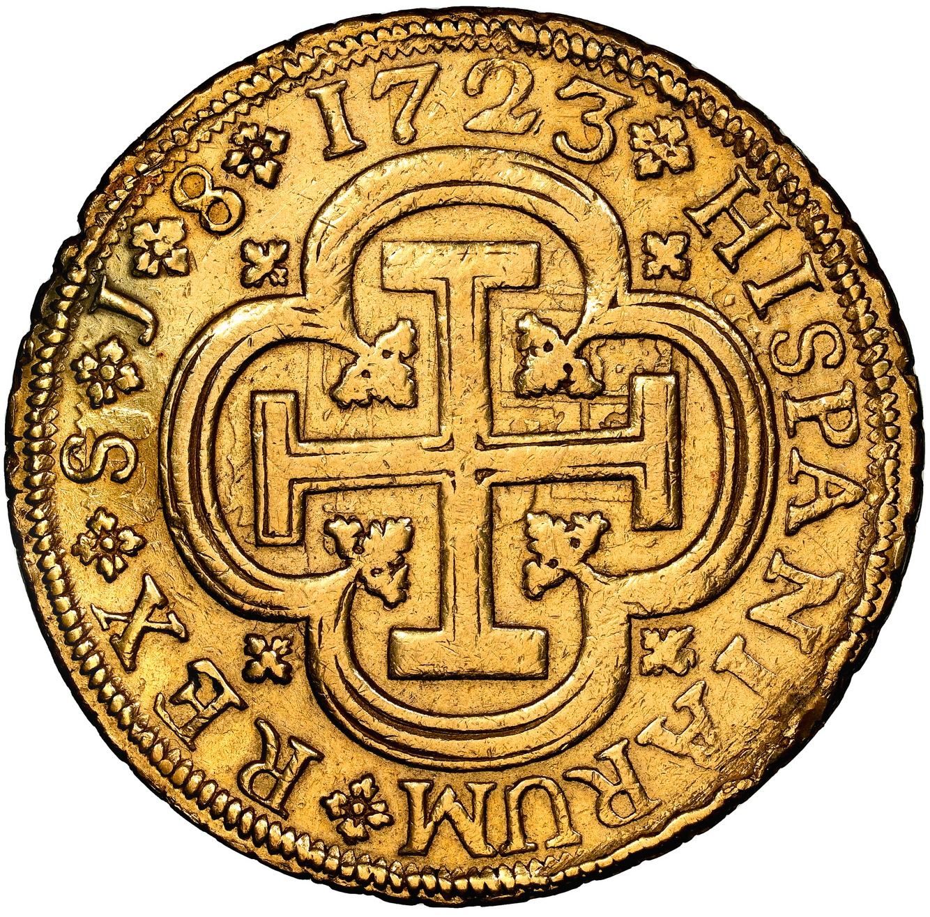 Seville, Spain, gold milled 8 escudos, Philip V, 1723 J, NGC XF details / removed from jewelry. Cal-2296; KM-315. Rare and desirable type with nice full details, albeit with polished surfaces and some small marks, slightly off-center obverse, traces of die-clashing on reverse.