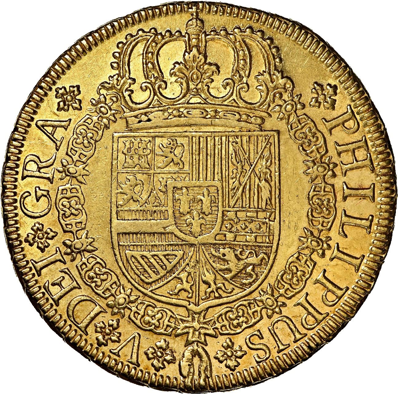 Seville, Spain, gold milled 8 escudos, Philip V, 1729 P, NGC MS 61, ex-J.O.B. Cal-2302; KM-315. 27.11 grams. Superb luster and details for the assigned grade (tied with one other for second finest in NGC census behind a single MS 62), with very faint adjustment marks on cross, very flashy and choice overall. NGC #5960432-003. Pedigreed to the J.O.B. Collection (stated on label), with collector's tag.