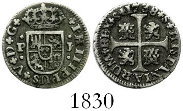 Seville, Spain, milled 1/2 real "quarter pistareen," Philip V, 1738PJ. CT-1936; KM-350.2. 1.4 grams. Richly toned VF+, parts of rims weak (as made).