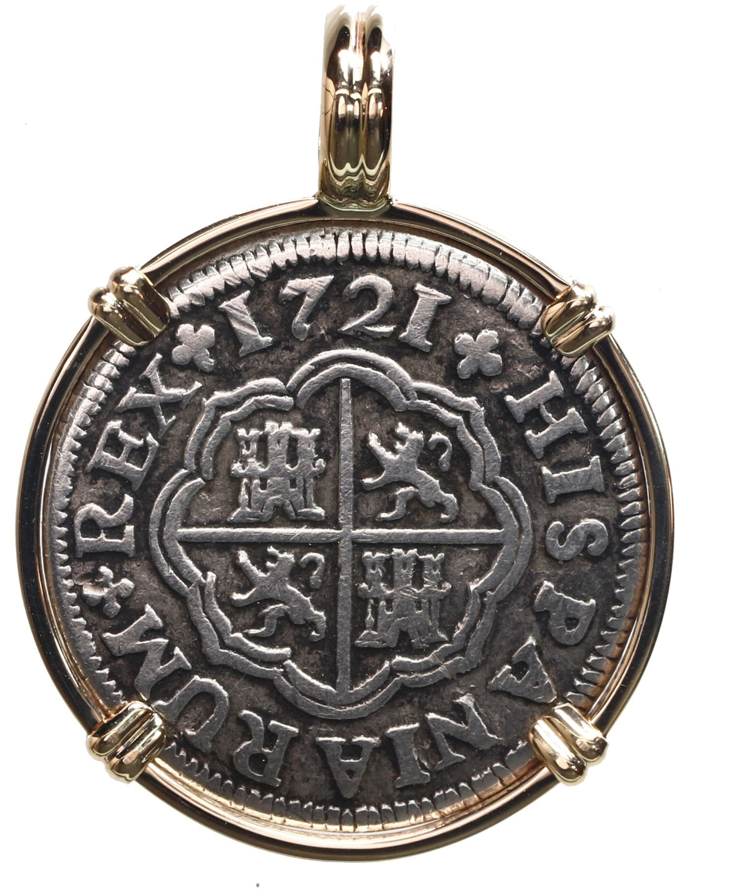 Seville, Spain, milled 1 real, Philip V, 1721 J, mounted in 14K gold bezel with fixed bail.