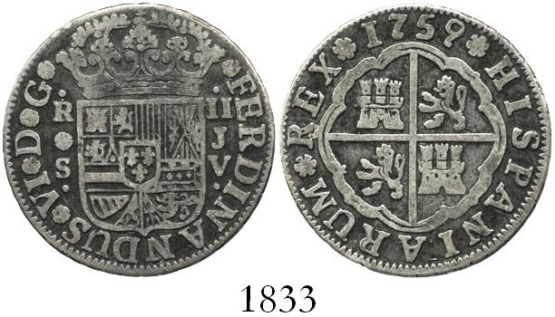 Seville, Spain, milled 2 reales "pistareen," Ferdinand VI, 1759JV. CT-525; KM-386.2. 5.5 grams. Richly toned VF, no problems, attractive strike as usual.