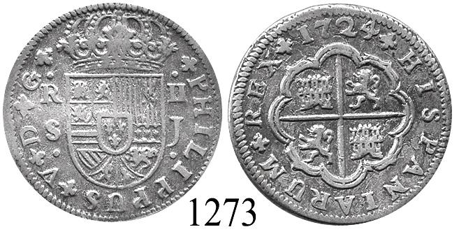 Seville, Spain, milled 2 reales "pistareen," Philip V, 1724J. CT-1029. 5.5 grams. Bold AXF with subtle toning, nice details.