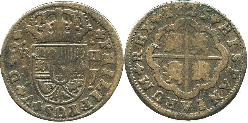 Seville, Spain, milled 2 reales "pistareen," Philip V, 1725J. CT-1427; KM-307. 4.0 grams. Deeply toned Fine+.
