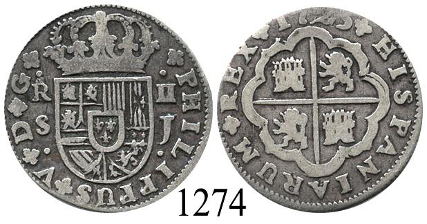 Seville, Spain, milled 2 reales "pistareen," Philip V, 1725J. CT-1030. 4.0 grams. Bold Fine with nicely contrasting toning on fields, part of rim weak (possibly shaved).