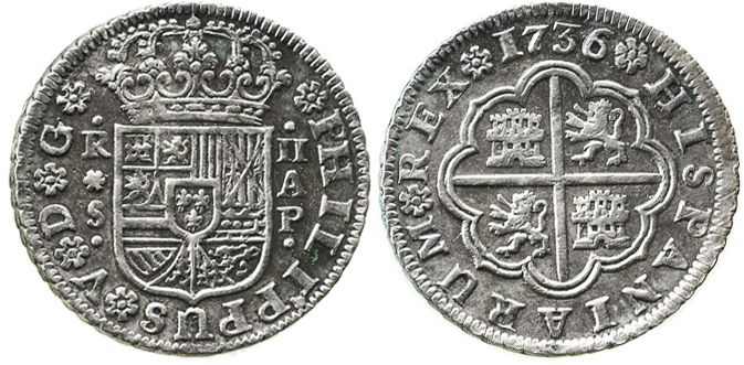 Seville, Spain, milled 2 reales "pistareen," Philip V, 1736AP, rare. KM-355; CT-1438. 6.0 grams. Super coin for sea-salvage, with full details all over (technically UNC), no corrosion, faint toning, also a popular type (legal tender in the early US), but unique for its provenance, and also a rare assayer (AP instead of PA). With Sedwick certificate from 2001. Recovered from: Unidentified ca.-1741 wreck in the Northern Caribbean