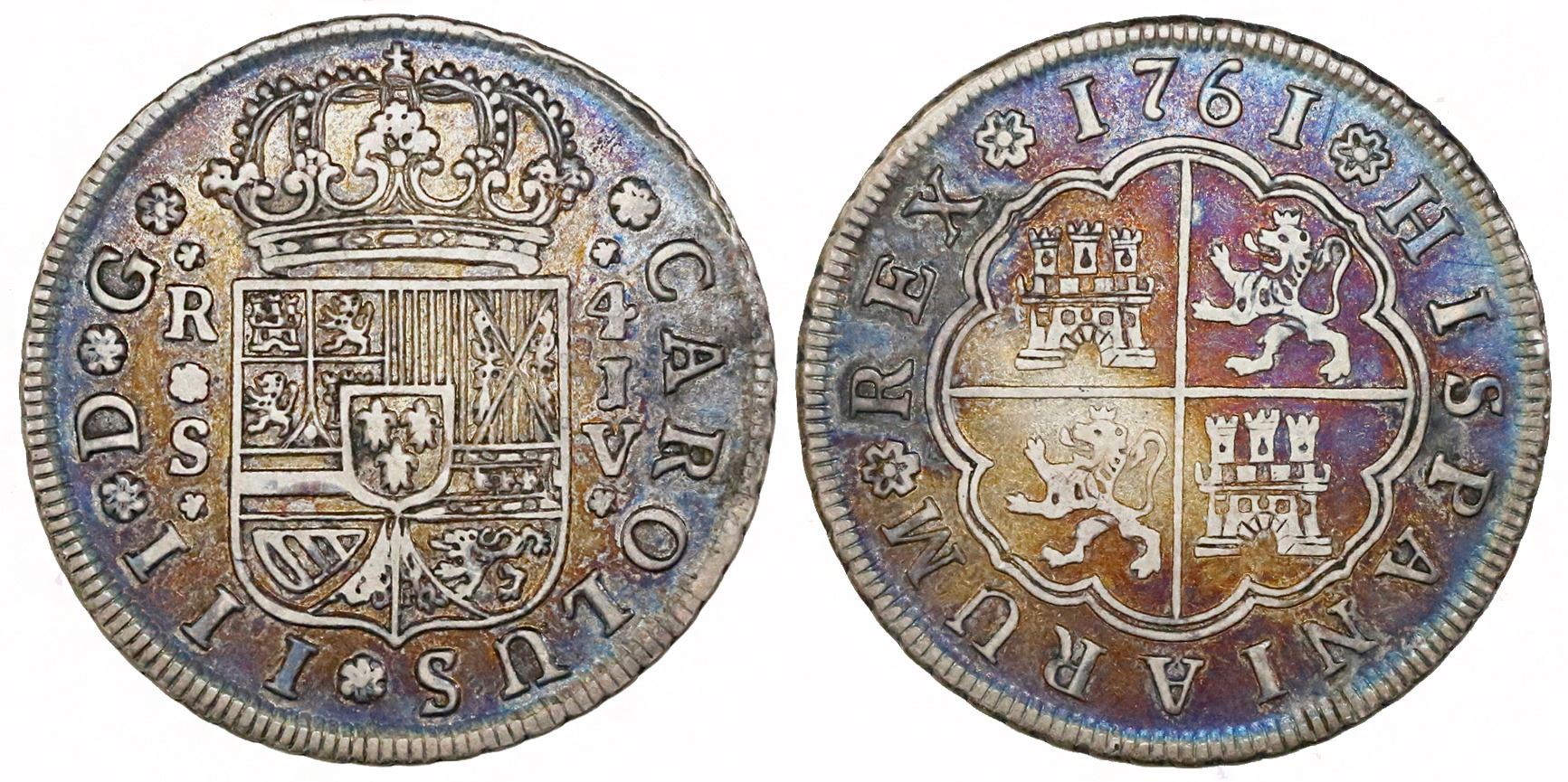 Seville, Spain, milled 4 reales "double pistareen," Charles III, 1761JV. CT-1218; KM-396.2. 13.21 grams. Choice XF with beautiful, vibrant rainbow toning in fields contrasting with lighter raised areas.