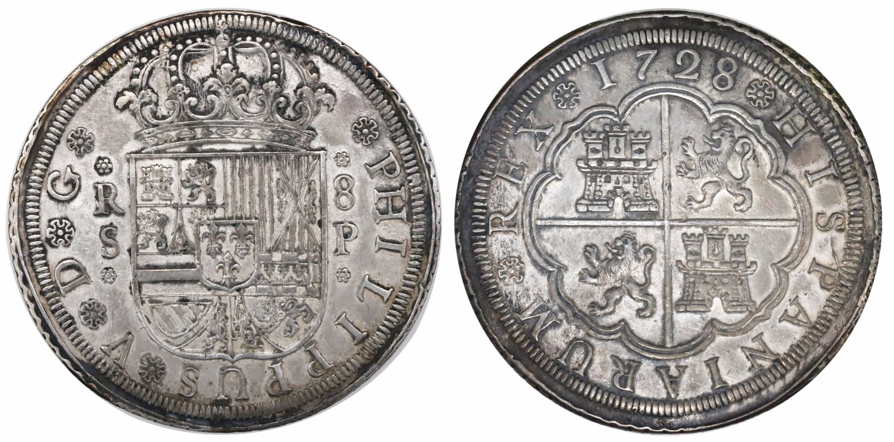 Seville, Spain, milled 8 reales, Philip V, 1728P. CT-938; KM-336.3. 26.84 grams. AU+ with nice luster and light toning, no problems, very attractive.