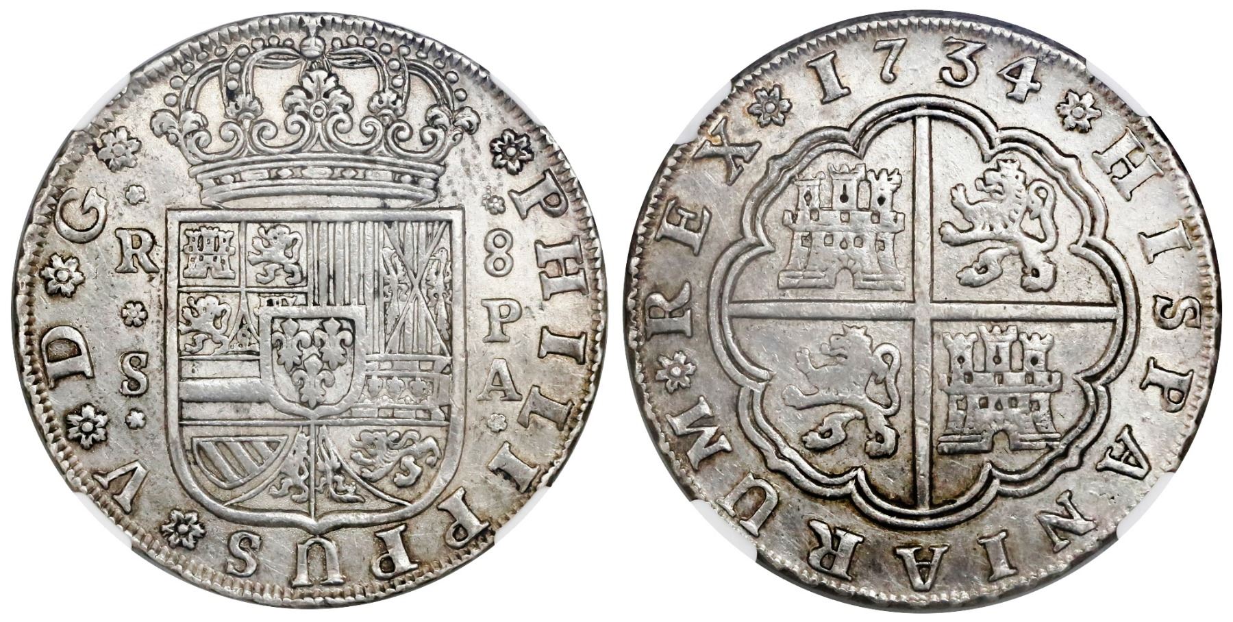 Seville, Spain, milled 8 reales, Philip V, 1734PA, NGC AU 55, finest and only known example in NGC census. CT-946; KM-358. Lustrous with gold toning on fields, light surface hairlines, tied with one other at PCGS for finest known between the two services, yet possessing better-defined details than that example. NGC #2823786-001.