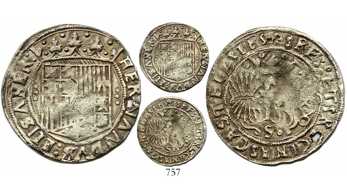 Seville, Spain (special issue for use in the New World), 1 real, Ferdinand-Isabel, mintmark S below crowned F on reverse, rare. CT-389. 3.19 grams. Bold full legends (all Latin lettering), full but partially weakly struck interiors, with clear mintmark at bottom of reverse and … ornaments (vertically) flanking the shield, lightly toned AVF with slight surface oxidation and holed near edge, rare and popular as a special design struck only for use in the New World.