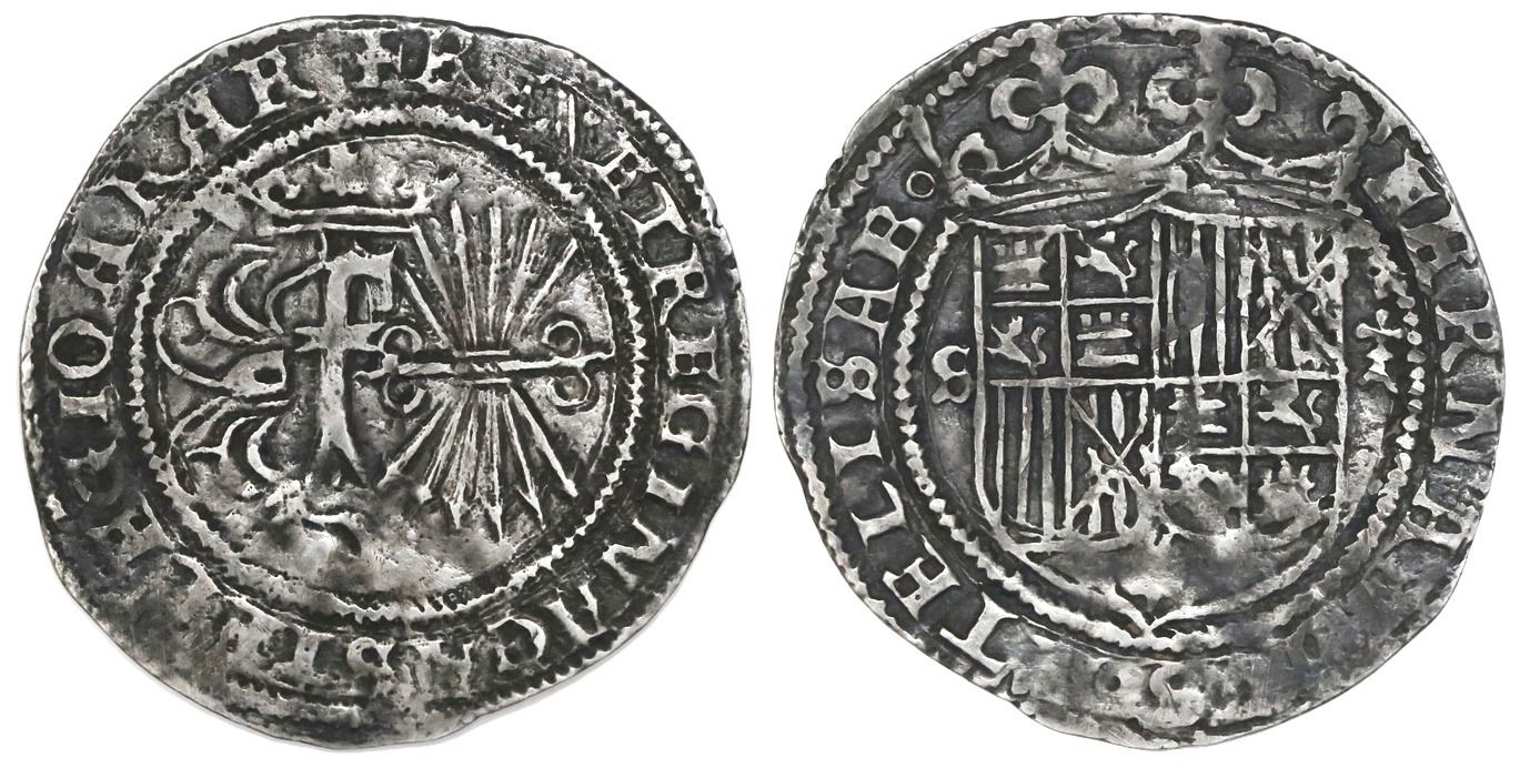 Seville, Spain (special issue struck for the Americas), 1 real, Ferdinand-Isabel, mintmark S to left, ermine to right, very rare. CT-unl (224 for Type). 2.50 grams. Broad, thin flan with 100% full details (including legends), unlisted variety (even missing in the exhaustive Lopez de la Fuente reference) with S-ermine as opposed to ermine-S, clear crowned F on reverse ("efe coronada" in Spanish) to denote a special striking (1505 decree) for importation to and use in the Americas, toned XF, inexplicably underweight.