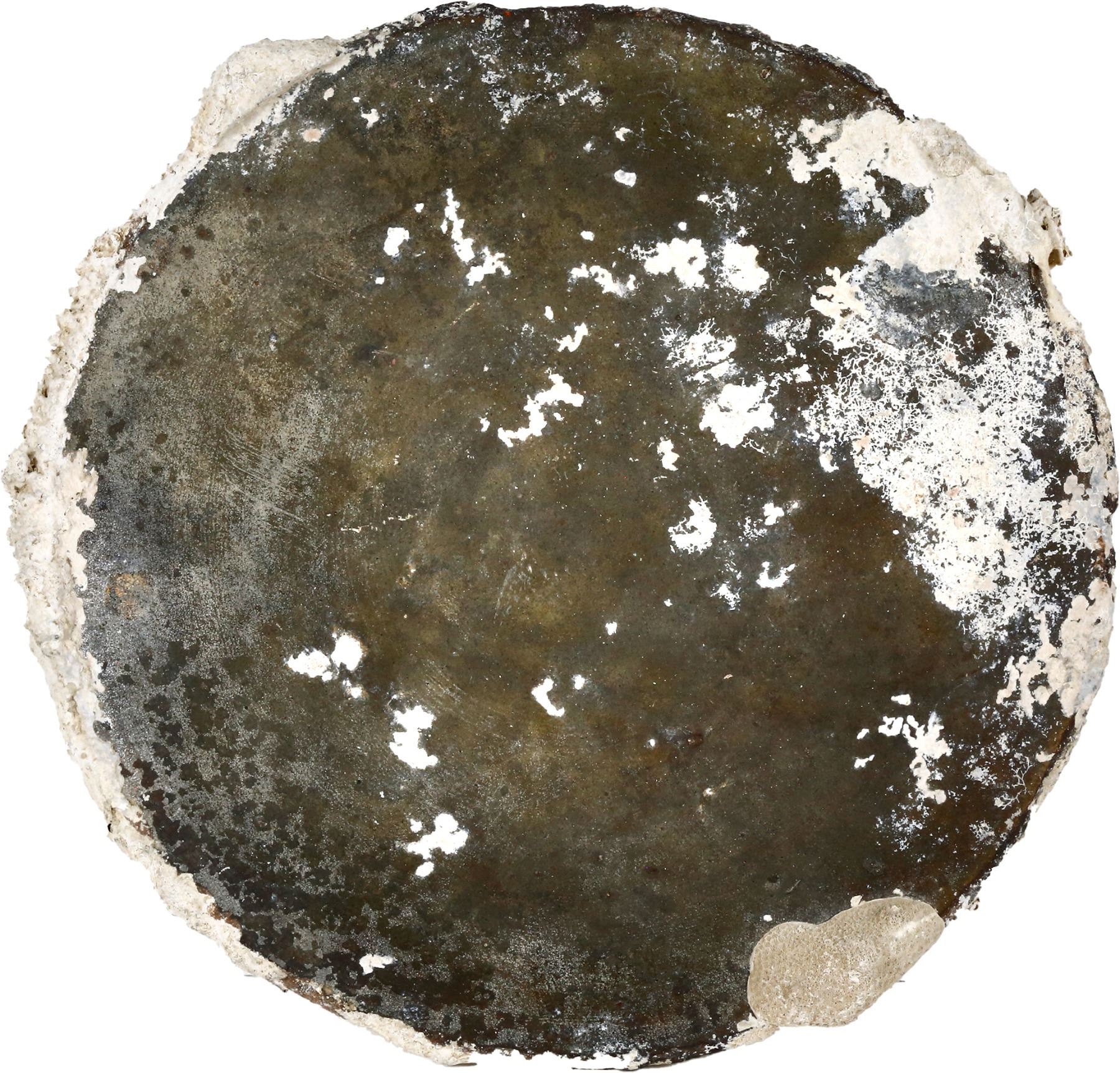 Shallow iron base or top with white coral encrustation, ex-Concepción (1641). 379 grams. 6½" diameter, 1" deep. Resembling a small, grayish, plain plate, but more likely a base or top to another piece, the bottom covered in interesting coral encrustation, completely intact. From the Concepción (1641), with original certificate from Captain Tracy Bowden through his contract with the Dominican Republic, and accompanied by the July 1996 issue of National Geographic signed by Captain Tracy Bowden on his article "Gleaning Treasure from the Silver Bank."