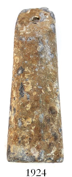 Ship's officer's sounding lead (small), probably 1700s. 392 grams; 3" long. One of the smallest sounding leads we have seen, but typically octagonal in cross section, with small hole at top and depression in bottom where wax was applied to test the sand but now filled with encrustation, the sides lightly encrusted as well. Recovered from: Unspecified wreck of the 1700s(?)