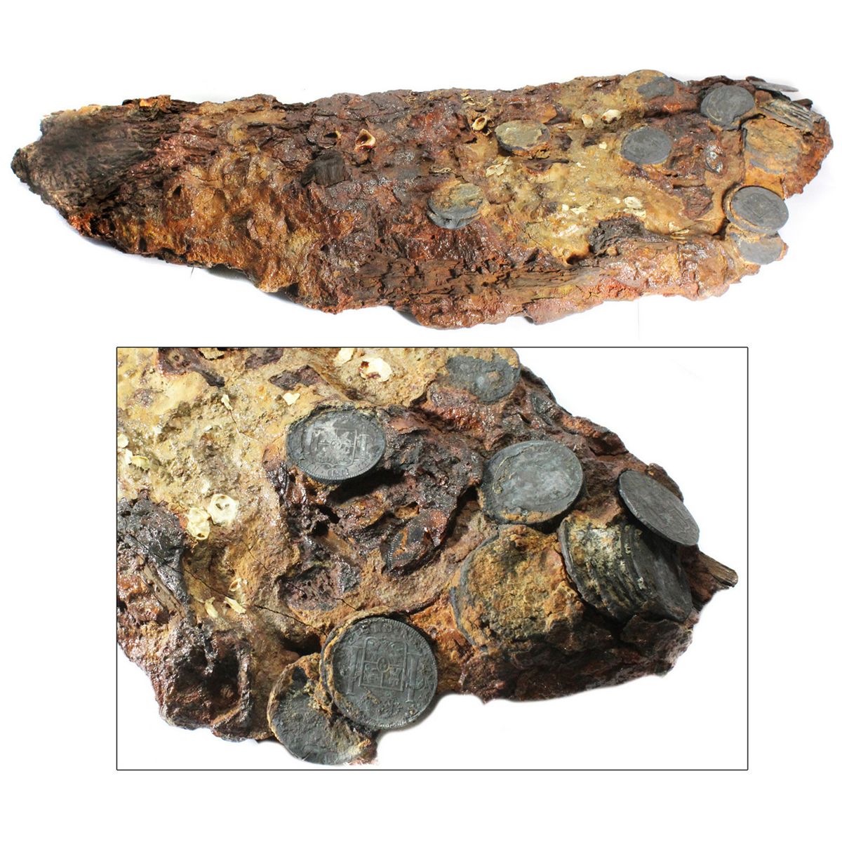 Side of wooden chest with 23+ coins encrusted on it (as found). 10 lb, approx. 25" x 9" x 3". This large and fragile display is basically a thick, wooden plank, worm-eaten at one end, with heavy encrustation holding white shell bits and eight clumps of coins onto one side and probably containing pieces of iron, as it is dark orange and cracking due to expansion, with a thin layer of lacquer on the surface for stability, among the most impressive artifacts from this highly promoted wreck, very eye-catching and substantial. (Pickup recommended, otherwise special shipping and handling fees will apply, and no international shipping available.) Recovered from: Cazador, sunk in 1784 off New Orleans in the Gulf of Mexico