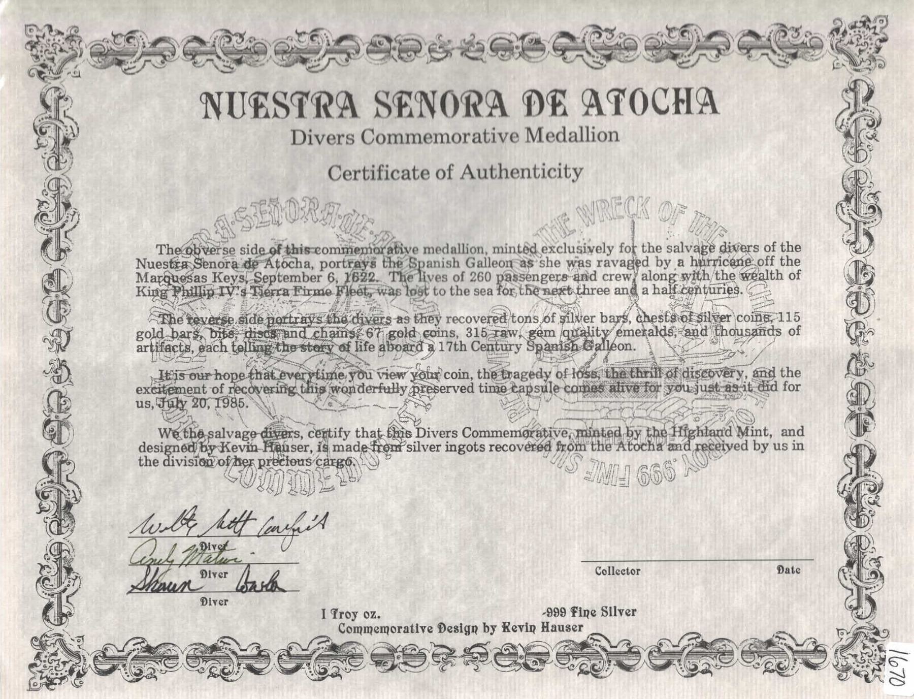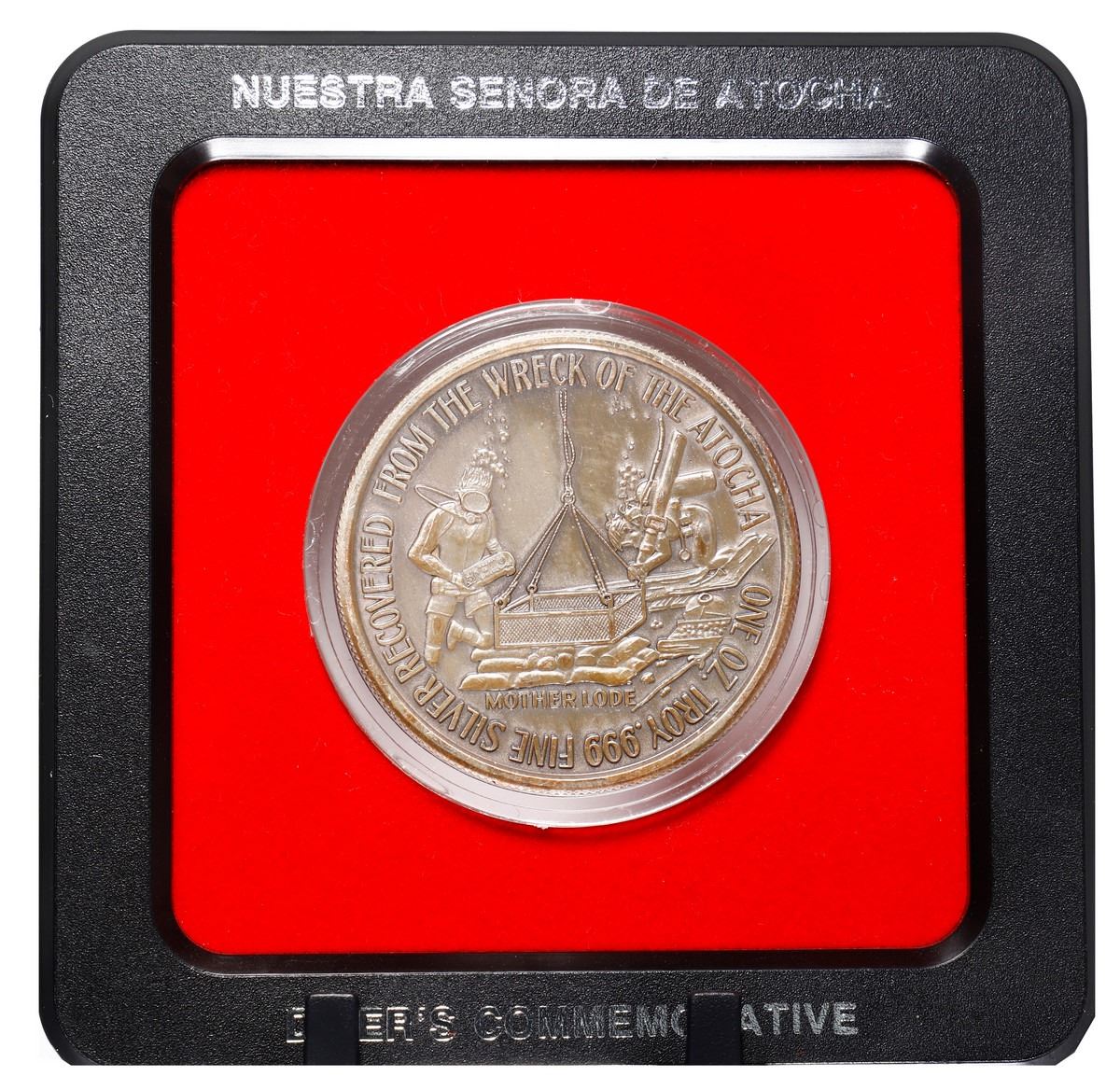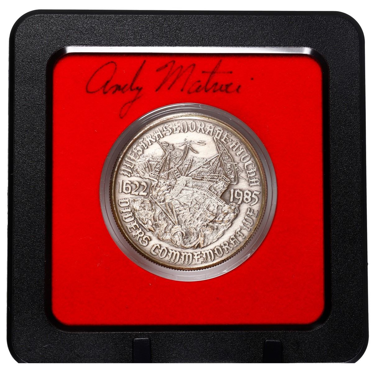 Silver 1-oz "Golden Crew" commemorative medallion made from Atocha silver in 1985, presented to diver Andy Matroci. 38 mm. frame is 3½" x 3½". Designed by Kevin Hauser and struck by the Highland Mint in silver from ingots recovered from the ship. Obverse: the Atocha sinking in the storm, flanked by dates 1622 and 1985, legend NUESTRA SENORA de ATOCHA above, DIVERS COMMEMORATIVE below; Reverse: two divers recovering ingots and coins from the wreck, MOTHERLODE below, ONE OZ TROY .999 FINE SILVER RECOVERED FROM THE WRECK OF THE ATOCHA encircling; Edge: reeded. Lightly toned UNC. The airtight attribution of this medallion to Atocha diver Andy Matroci could hardly be more significant, as it was Andy and his dive partner, Greg Wareham, who first saw the "Mother Lode" on July 20, 1985, while acting on Andy's hunch to check the southeast corner of the hole they had just blown from Kane Fisher's boat, the Dauntless. The divers working the site at the time became known as the "Golden Crew"; Andy went on to continue the search for more treasure on the Atocha and Santa Margarita as captain of the salvage vessel J.B. Magruder before retiring in 2021. with original certificate and custom stand signed by Andy Matroci.