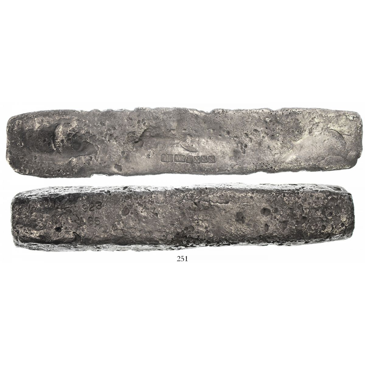 Silver "barreton" ingot #923, 16 lb 5.76 oz troy, Class Factor 0.6. Approx. 13-7/8" x 2-1/2" x 1-1/4". Amongst the huge loaves of silver on this wreck were some smaller "rails" of silver known as "barretones," like this one, which shows a clear fineness IIUCCCLXXX (2380/2400) and 3 large circular tax stamps with parts of PHILIPPVS visible, diagonal assayer's "bite" in one corner, the surfaces somewhat corroded but the low Class Factor also due to the fact that the smaller "barretones" were considered less desirable by the evaluators in Key West, despite the fact that smaller bars are more affordable and portable. From the Atocha (1622, with Fisher photo-certificate #1100.