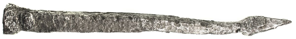 Silver (contraband) spike, very rare and important. 220 grams, 7-1/2" long. At various times since at least the 1950s, locals have found coins and small silver ingots in the vicinity of a nuclear power plant on the east coast of Florida, undoubtedly evidence of a Spanish shipwreck in the ocean nearby, and like all Spanish ships, this one apparently had contraband like this piece, which was cast from pure silver and delicately hammered into the ship to be retrieved later by the smuggler who know just which spike was the "one," with moderate surface corrosion but still straight and solid and with head and point still intact, a unique item with very rare provenance. Recovered from: "Power Plant wreck" (late 1500s) off Hutchinson Island, Florida