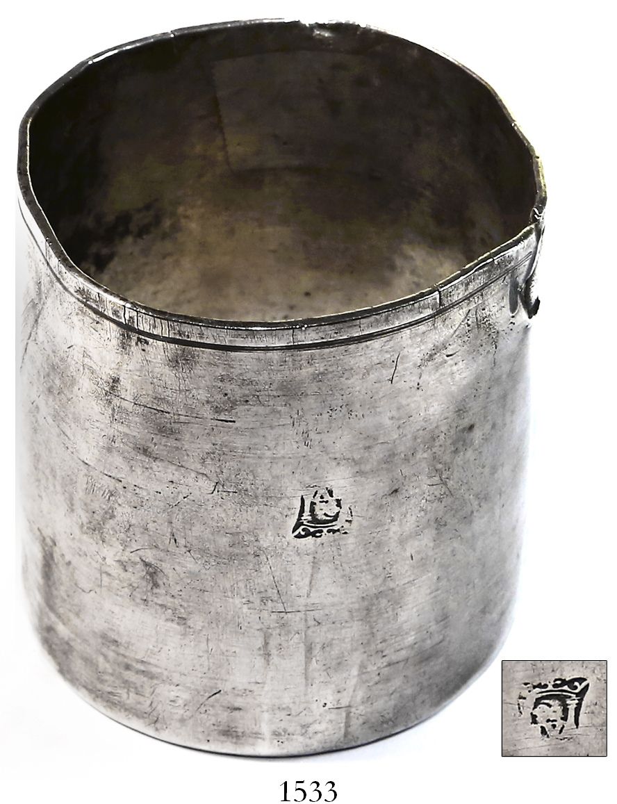 Silver cup with Mexican silversmith stamp from the late 1600s, found on land north of the 1715 Fleet area, pictured and described in West of the Bull (Armstrong, 2013). 175 grams, 2-5/8" tall and 2-1/2" in diameter. This solid, uncorroded silver artifact (still bright and shiny like when it was made) was found by the Andrews family on Playalinda Beach in 1960 in an area believed to be filled in from borrow pits much farther south. The marking is listed in Marcas de Plateria Hispanoamericana (Esteras Martin, 1992) as possibly Nueva Veracruz (with the letters NV appearing below the head of Charles II between two pillars) in Mexico, ca. 1675-1700. Intact except for minor crease where it was re-straightened and small split at top. Pictured on page 25 of West of the Bull, by Armstrong (2013), a copy of which (autographed by Randy Andrews) is included with this lot. Recovered from: Spanish 1715 Fleet, east coast of Florida