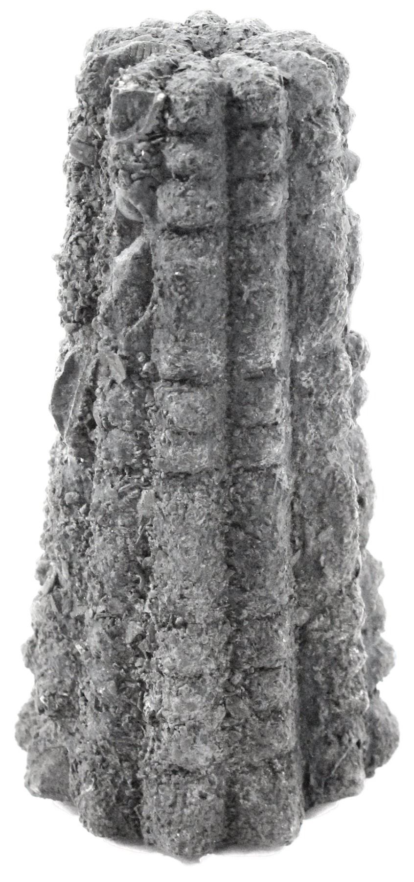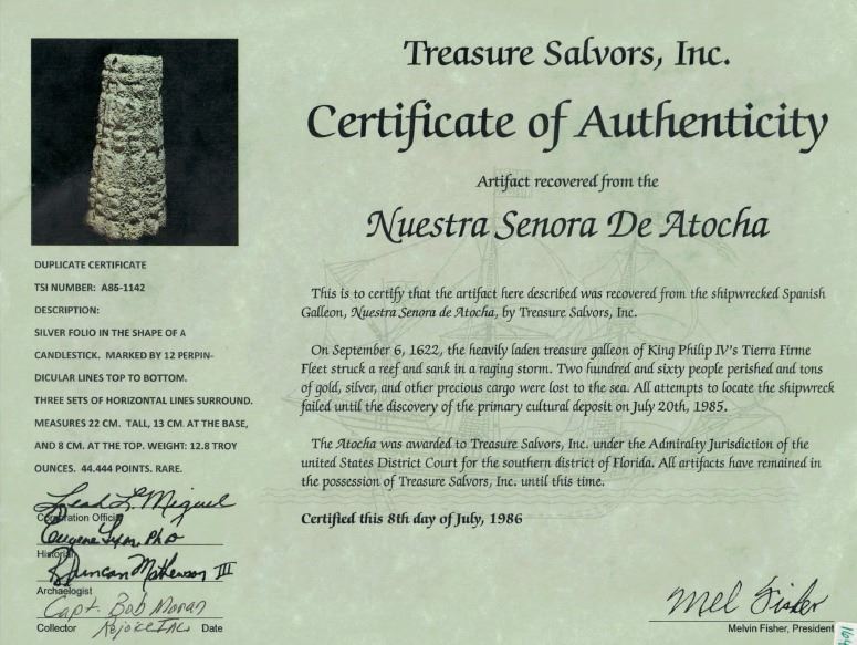 Silver "folio" (small pedestal), 12.8 oz troy, from the Atocha (1622). 417 grams, 4-1/4" tall, 2" base diameter. Labeled a "folio" on the Treasure Salvors certificate, very similar examples can be found in the Christie's 1988 sale of Atocha material and listed as a silver tapering column of unknown purpose. These cones were found tightly packed in wooden chests in the cargo area, and since some have religious symbols on them, they may have been ingots intended as a devotional offering. This piece is a cone of twelve perpendicular lines from top to bottom and ten horizontal rings all wrapped around a tapering hollow center. From the Atocha (1622), Fisher database #A86-1142-2, with photo-certificate signed by Bob Moran, plus photocopy of 1987 division showing points value of 44.44 points.