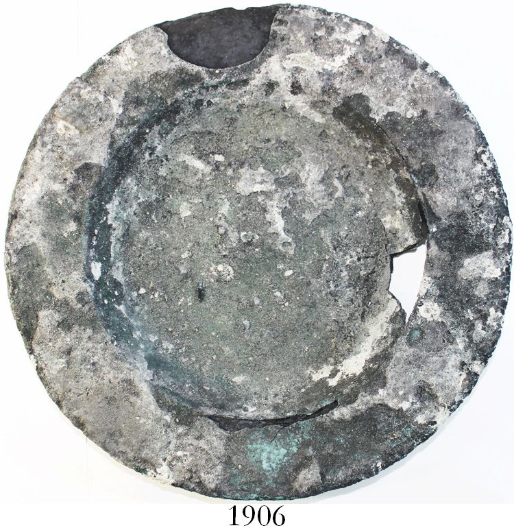 Silver plate, encrusted but intact. 587 grams; 9-1/2" in diameter. Small but typical shallow dish with 1-1/2" rim, encrusted in white on bottom but the top part gray, with small piece missing under the slightly split rim, otherwise intact. Pedigreed to our Auction #11, with original lot-tag #1415, and with Fisher photo-certificate #131. Recovered from: Atocha, sunk in 1622 west of Key West, Florida