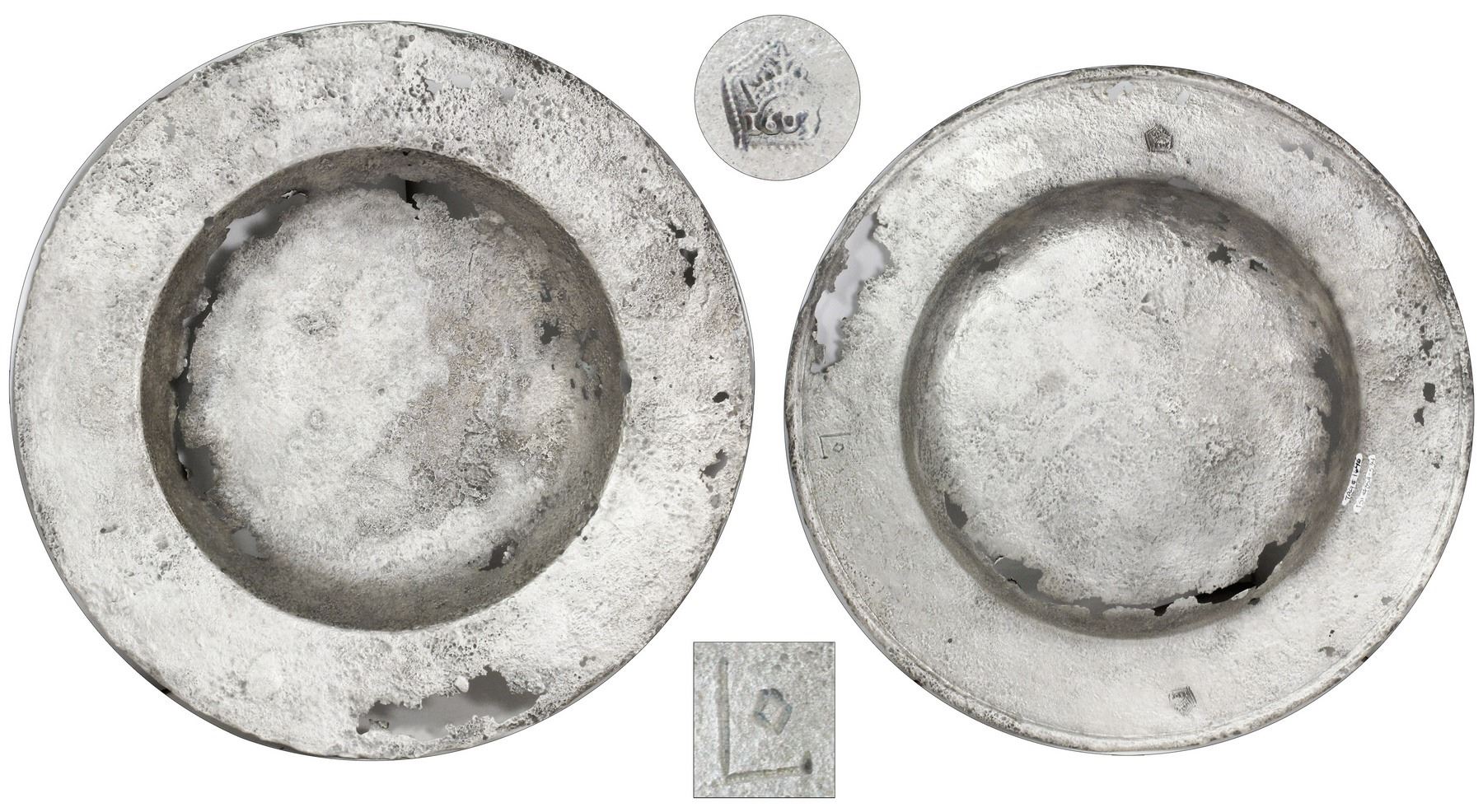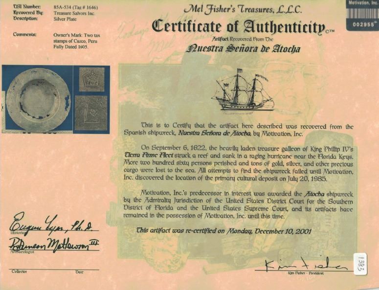 Silver plate with tax stamps for Cuzco, Peru, showing date 1605 (1603?), ex-Atocha (1622). 248 grams, 9-1/4" diameter, 1-1/4" tall. Lightweight light-colored plate with spots of corrosion that actually enhance its beauty and authenticity, two tax stamps (both dated 1605) and an owner's mark on back side. From the Atocha (1622), with Fisher photo-certificate #85A-534.