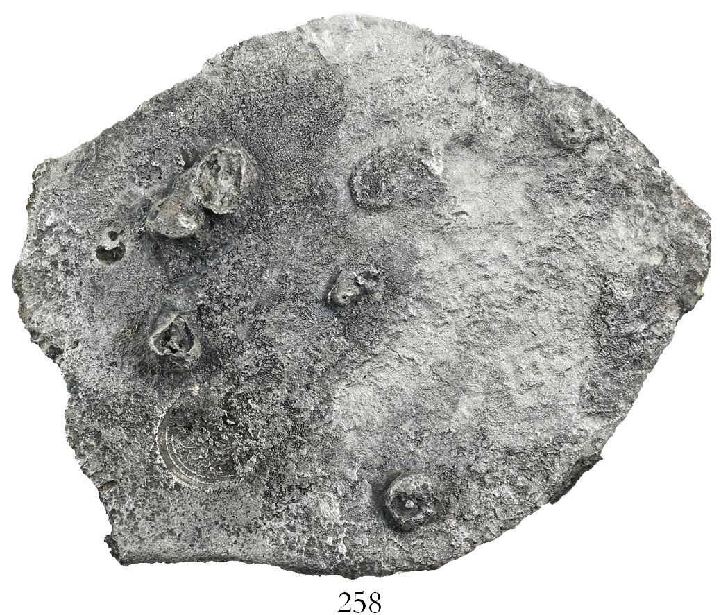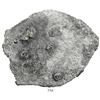 Silver "splash" ingot #15, 408 grams, marked with crowned-C tax stamp, from the "Golden Fleece wreck" (ca. 1550). 4-1/2" to 5-1/2" in diameter. A thin oval of silver with point at one end and "break" at other end, drip blobs on top, one bold but partial circular tax stamp but no other markings, traces of encrustation near edge on bottom. From the "Golden Fleece wreck" (ca. 1550), with Sedwick certificate from 2000.
