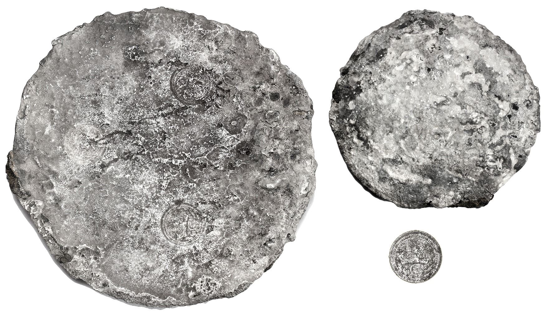 Silver "splash" ingot, 1718 grams, with three crowned-C tax stamps, from the "Golden Fleece wreck" (ca. 1550). 6" in diameter, up to 1/2" thick. Perfectly round but with rough surfaces and edge (mostly due to corrosion), with three full (two bold) circular tax stamps on flat top showing a crowned C (for Charles I) inside a ring, the top somewhat dark but the bottom whitish and silvery, traces of brownish encrustation in crevices. From the "Golden Fleece wreck" (ca.1550), with Sedwick certificate from 2004.