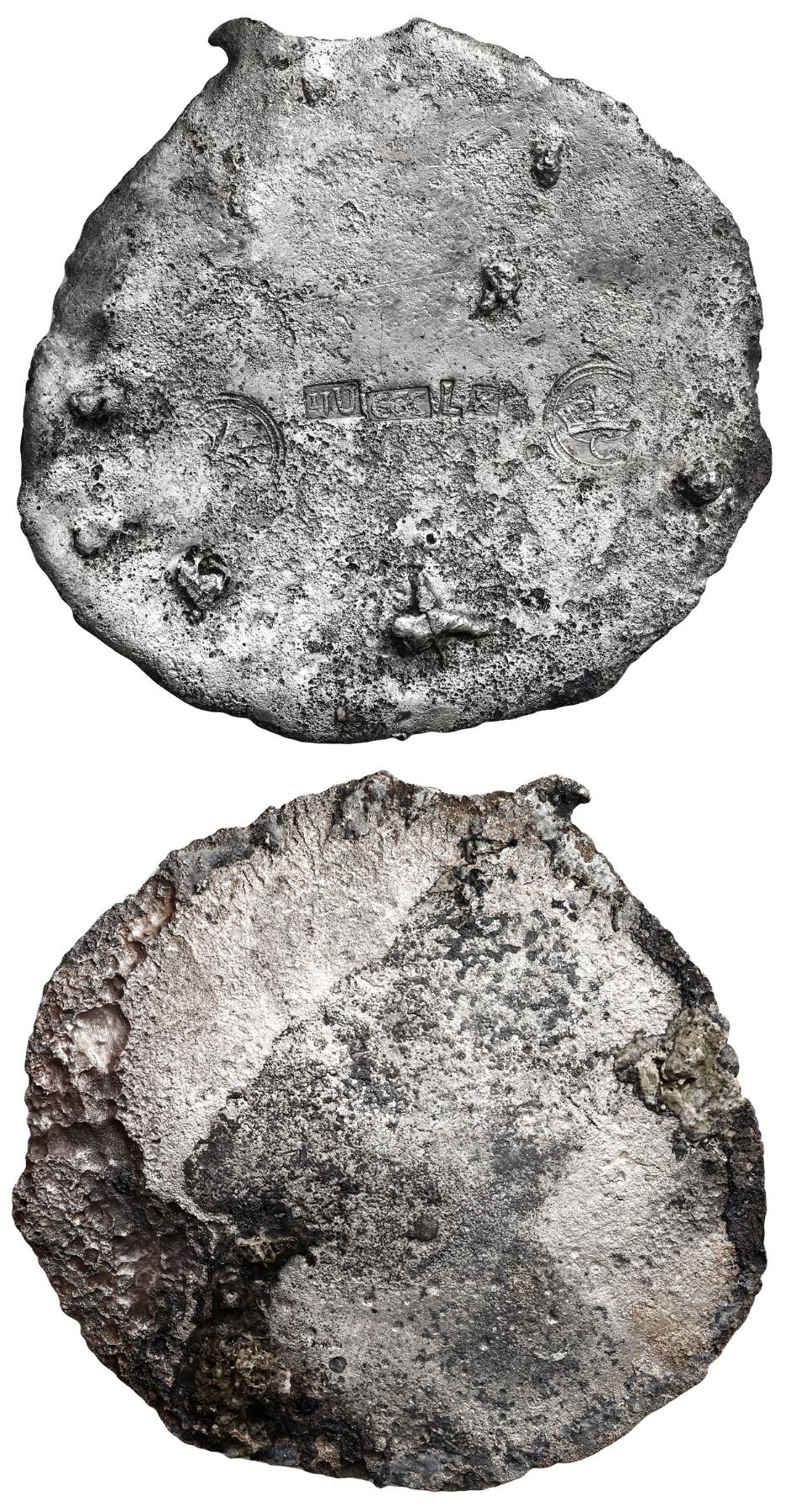 Silver "splash" ingot, 528 grams, marked with fineness IIU CCC L X (2360/2400, 98.3% fine) and circular crowned-C tax stamp (Charles I), ex-"Golden Fleece wreck" (ca. 1550). 5" diameter, 1/4" thick. About the size and thickness of a pancake but with about seven little "drip blobs" on top surface, across the middle of which appears clear markings of fineness in five small boxes bookended with two clear and nearly full crowned-C tax stamps, the bottom with areas of peripheral coral encrustation and minor corrosion, bright silver in color overall, desirable as among the better-marked ingots from this early wreck. From the "Golden Fleece wreck" (ca. 1550).
