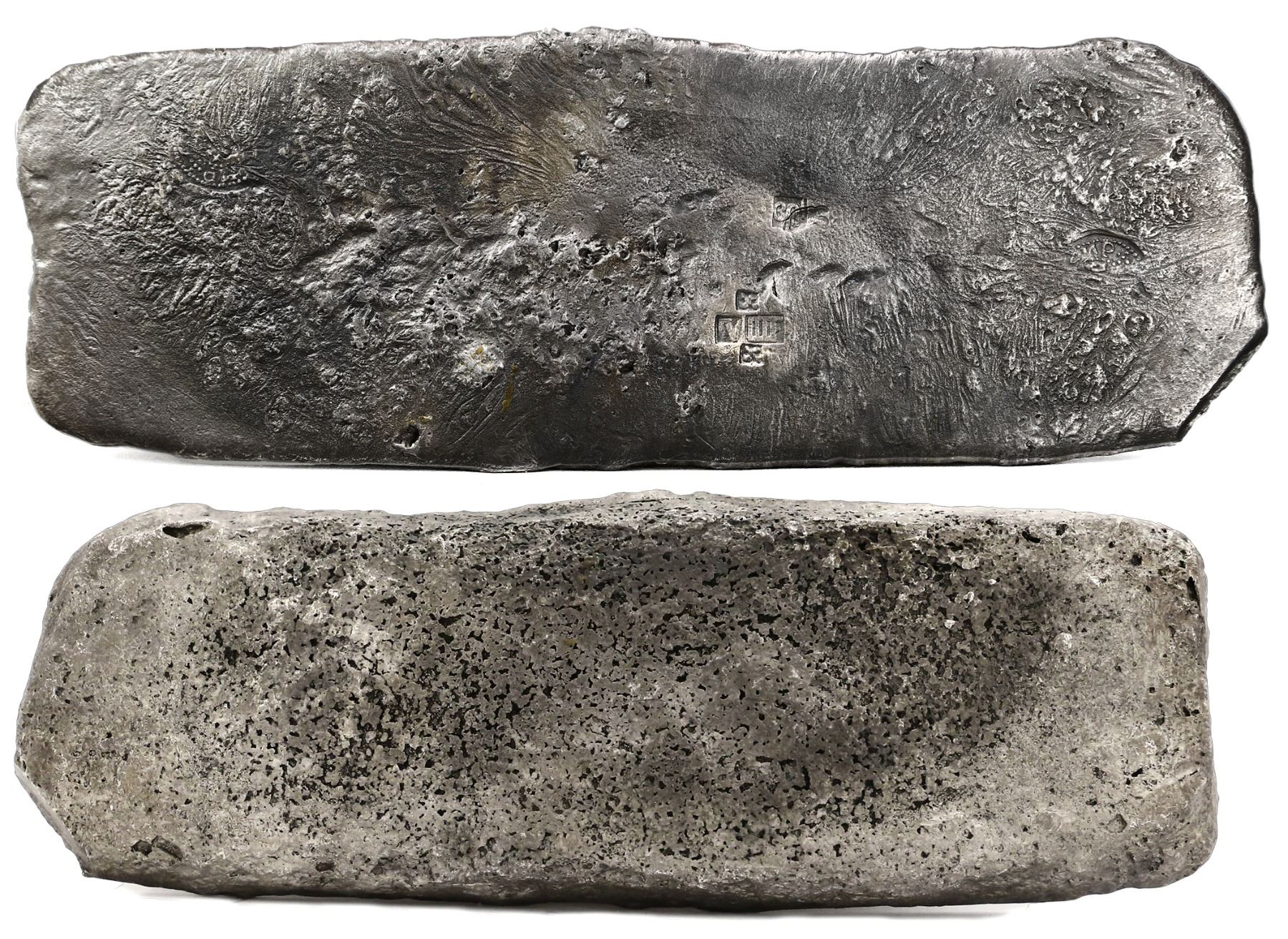 Silver "tumbaga" bar #M-115, 7.08 lb av, marked with finenesses IV IIII (1400/2400) and iUB (1500/2400) and two partial tax stamps, ex-"Tumbaga wreck" (ca. 1528), Garcia-Barneche Plate. 10" x 3-1/2" x 1". A thick, rectangular ingot with "sunburst" texture on top surrounding two different sets of fineness-assayer markings (with raised lettering inside boxes), being IV IIII with small s's above and below for 1400 (58.3% pure) and YB13 next to an incuse S and iUB for 1500 (62.5% pure), also with bold partial circular tax stamps near each end, with neatly sliced diagonal assayer's "bite" in one corner, the other side of the bar very granulated and bumpy, even silver color with some toning. From the "Tumbaga Wreck" (ca. 1528), plated on p. 110 of Agustin Garcia-Barneche's The "Tumbaga" Saga (2nd ed, 2018), with Sedwick photo-certificate.