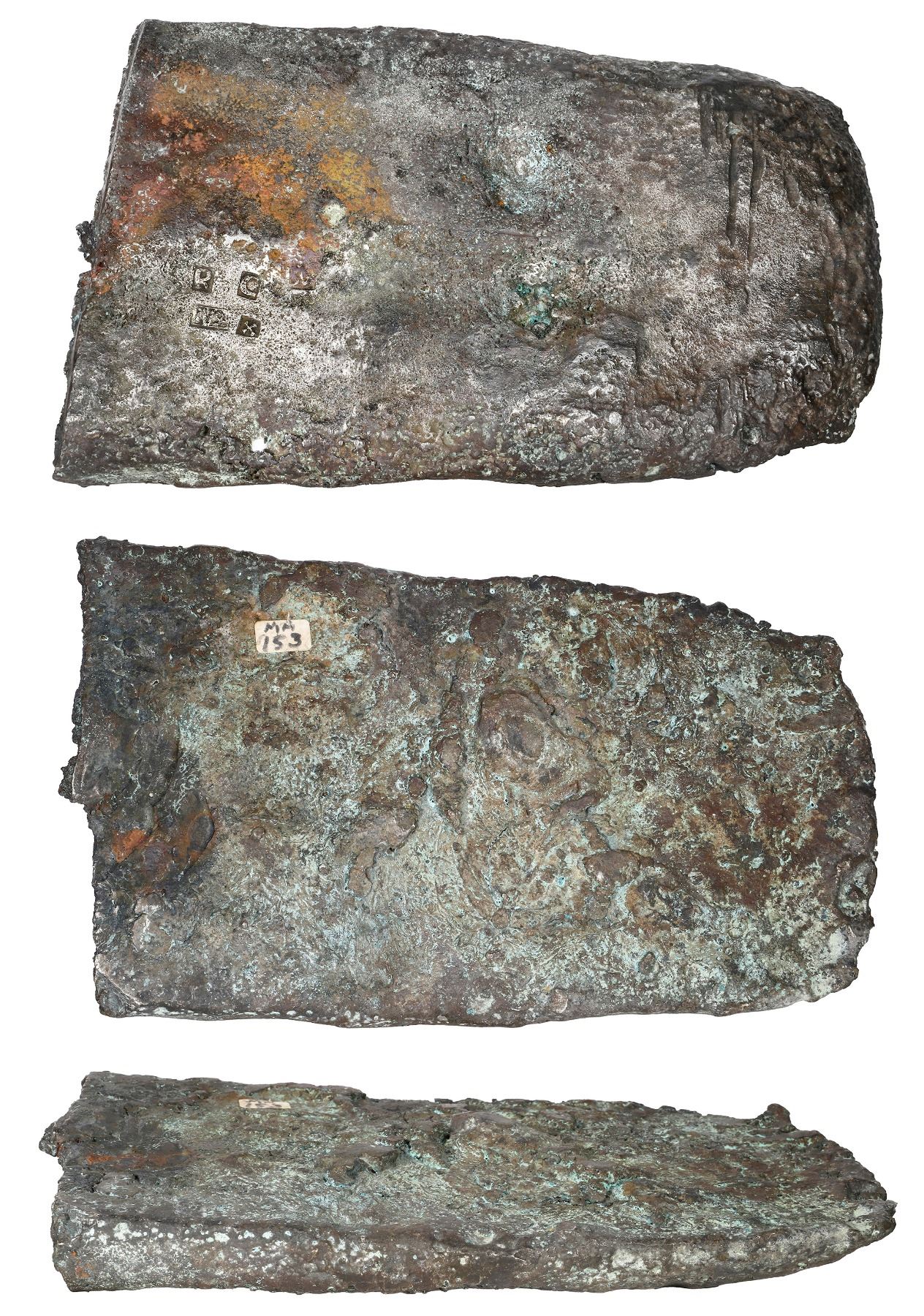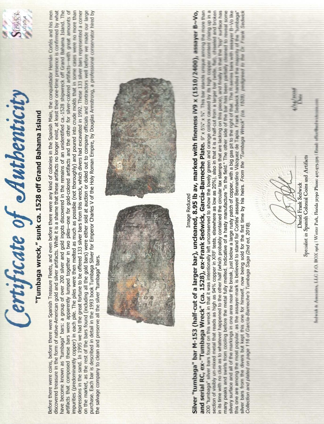 Silver "tumbaga" bar M-153 (half-cut of a larger bar), uncleaned, 8.95 lb av, marked with fineness iV9 x (1510/2400), assayer B~Vo, and serial RC, ex-"Tumbaga Wreck" (ca. 1528), ex-Frank Sedwick, García-Barneche Plate. 9" x 5¼" x ¾". This bar stands unique among the more than 200 "tumbaga" silver bars found on this wreck in that it was intentionally left unconserved to show the lovely green and orange colors caused by its high copper content (rising up in a section of visibly un-mixed metal that reads as high as 94% copper in XRF tests, elsewhere as low as 20%), also in that it is a half-cut from a larger bar (wide, flat), chiseled and broken in its time with no clue as to whatever happened to the other half (which probably contained the circular tax stamps that are lacking on this piece), and finally in that the "top" surface has many peaks and swirls from cooling before the metal fully melted, indicative of a hasty manufacture "in the field." The other side of the bar has been partially cleaned to reveal some silvery surface and all of the markings in one area near the break, just below a large rusty patch of copper, with a big gas pit to the right of that. The R-series bars with assayer B~Vo like this one are among the most popular, as the assayer-mark is believed to stand for Cortés' assayer Bernardino Vázquez de Tapia. Frank Sedwick handled the majority of the "tumbaga" silver bars from the divers but kept this one for himself, now being sold for the first time by his heirs. From the "Tumbaga Wreck" (ca. 1528), with photo-certificate, pedigreed to the Dr. Frank Sedwick Collection and plated on page 116 of García-Barneche's Tumbaga Saga (2nd ed, 2018).