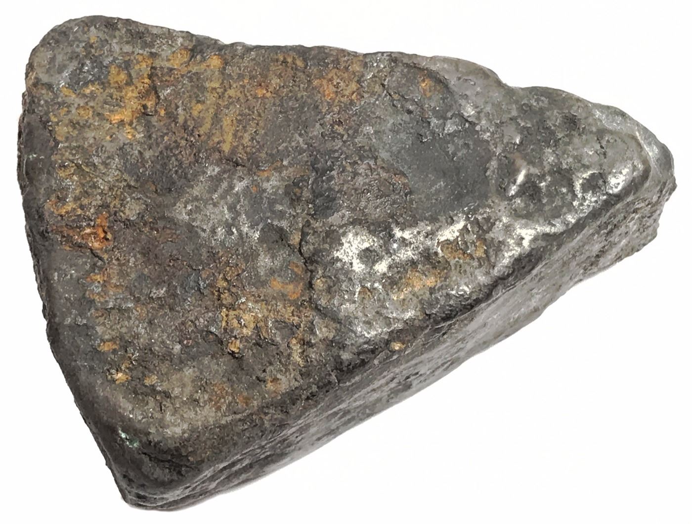 Silver "wedge" ingot (contraband or amalgam), 719 grams, from the 1733 Fleet, ex-McKee Museum. 4" x 3" x 1-3/4". "Wedge" ingots like this are fairly normal finds from the Spanish Fleets of 1715 and 1733, and while the predominant theory for their existence is contraband (arranged in a pie at the bottom of a barrel, so the story goes), it is significant that most of the wedges are much lighter than their size would indicate, lending credence to the opposing theory that they are simply an intermediate stage in the silver refining process in which the silver is still a lighter amalgam. In any case this piece is typically unmarked and shows a dark gray tone all over with spots of orange in crevices. Despite a lack of certification from the McKee Museum itself, we have seen a letter from Art McKee's personal files showing that this piece was to Mr. Jack Carr in 1955. From the 1733 Fleet, pedigreed to the McKee Museum and to our Auction #16, with original lot-tag #214, and to our Auction #8 (lot #420).